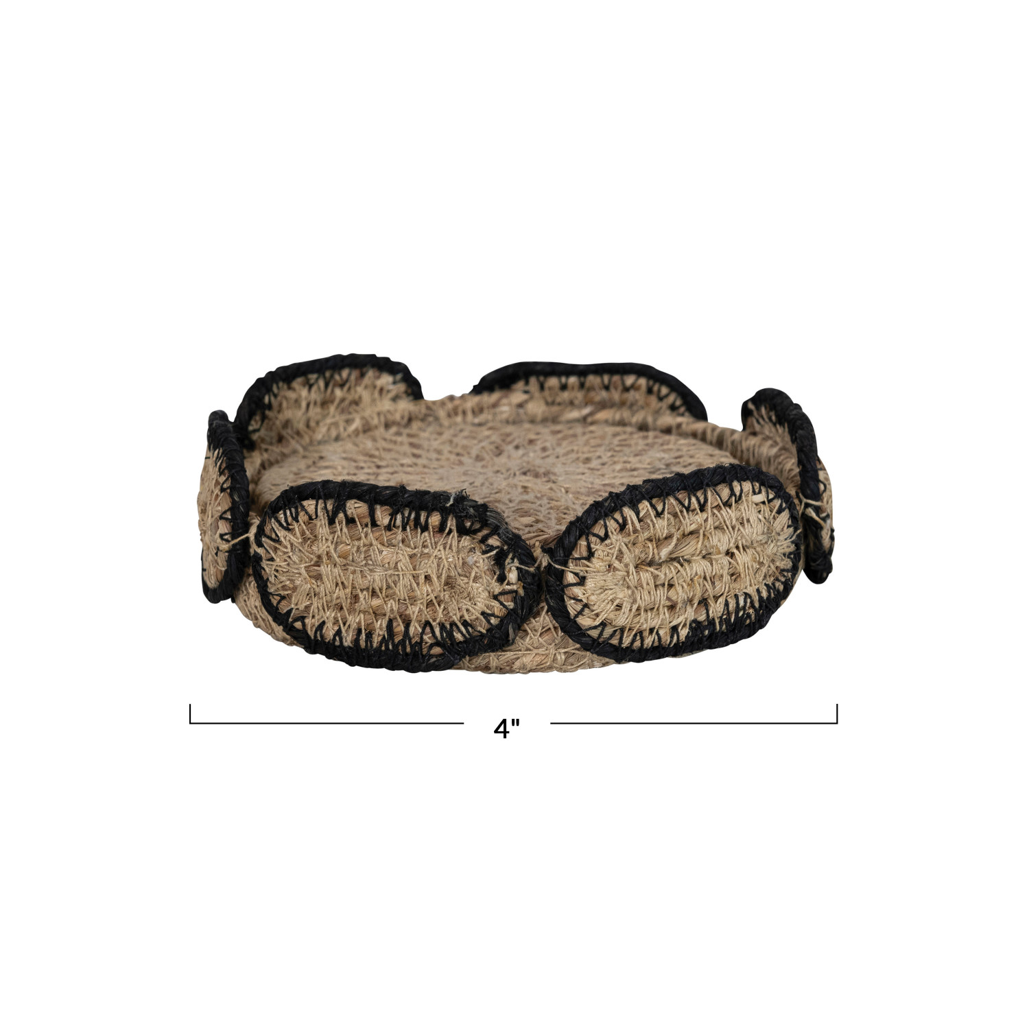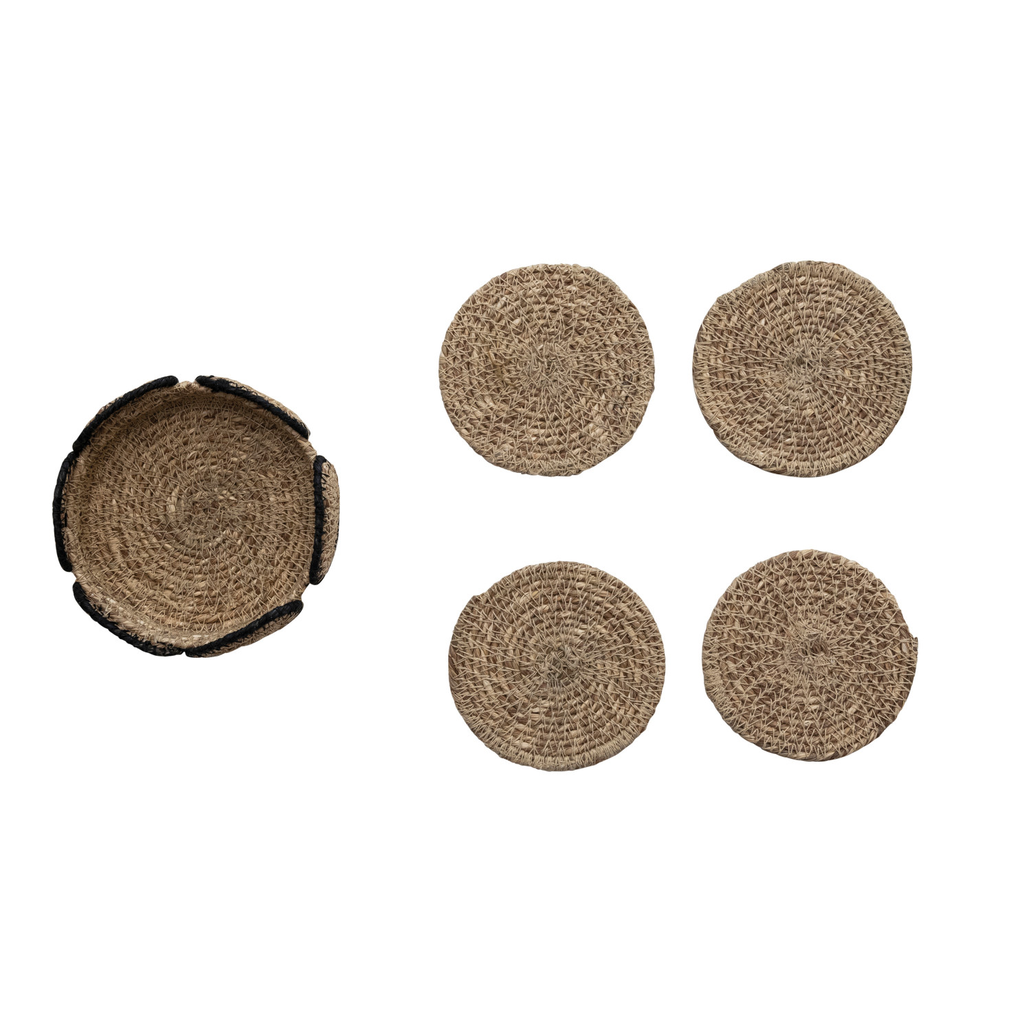Hand-Woven Seagrass Coasters w/ Basket, Natural & Black, Set of 5