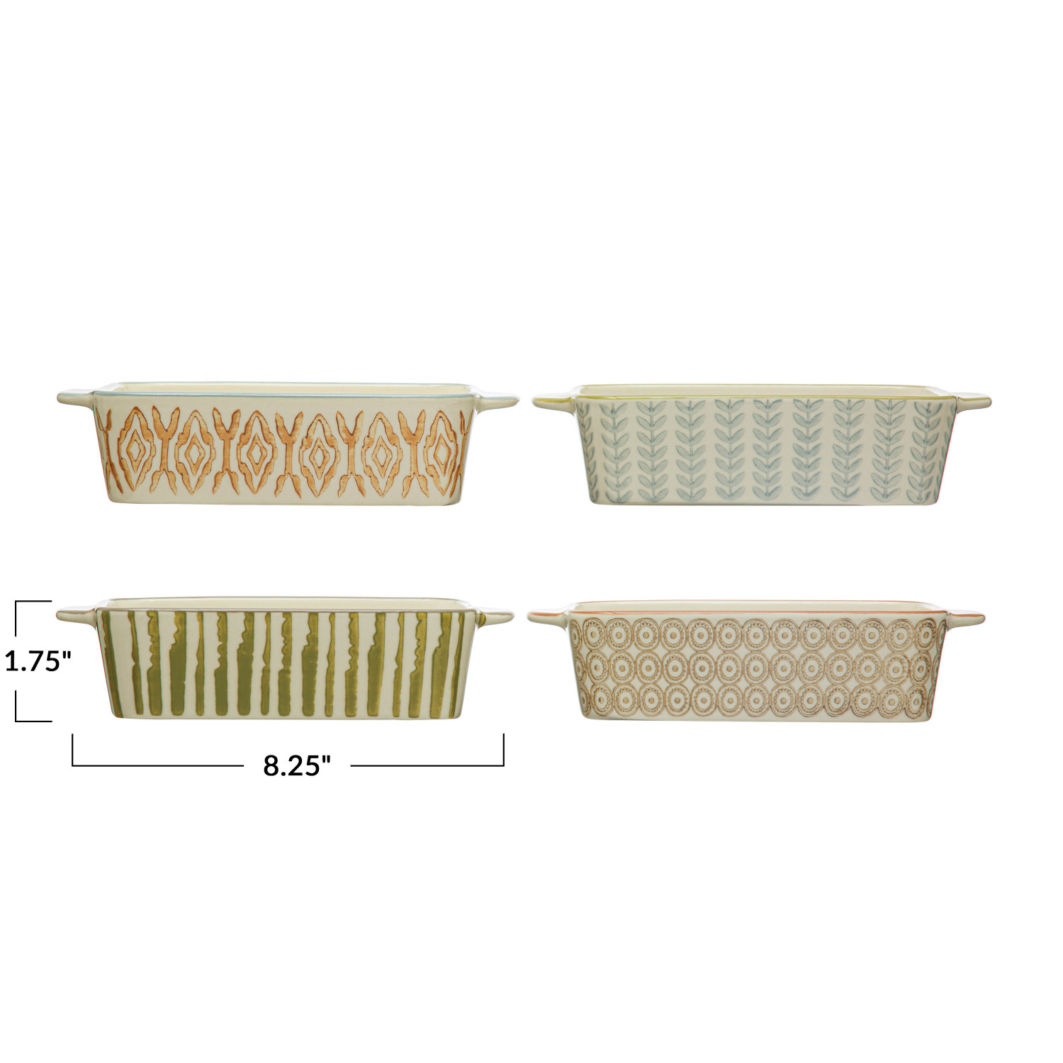 Catalog Name: 8-1/4"L x 4-3/4"W x 1-3/4"H 2-1/2 Cup Hand-Stamped Stoneware Baker w/ Pattern, Multi Color, 4 Styles