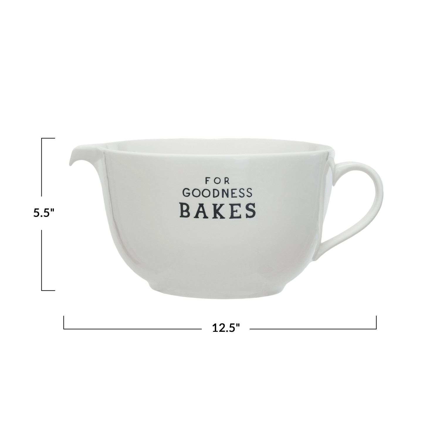 This "For Goodness Bakes" Batter Bowl is a delightful addition to any baker's collection. Measuring 12.5 inches long and 5.5 inches high, its oval shape and generous size make it ideal for mixing everything from pancake batter to bread dough. Crafted from white stoneware, it's sturdy enough for everyday use yet stylish enough to fit into eclectic, farmhouse, or French country-themed kitchens. Whether whisking up a storm or simply displaying it on the countertop, this batter bowl infuses charm and functionality into the culinary space. With its classic design and practical features, this batter bowl is sure to become a favorite tool in the kitchen.