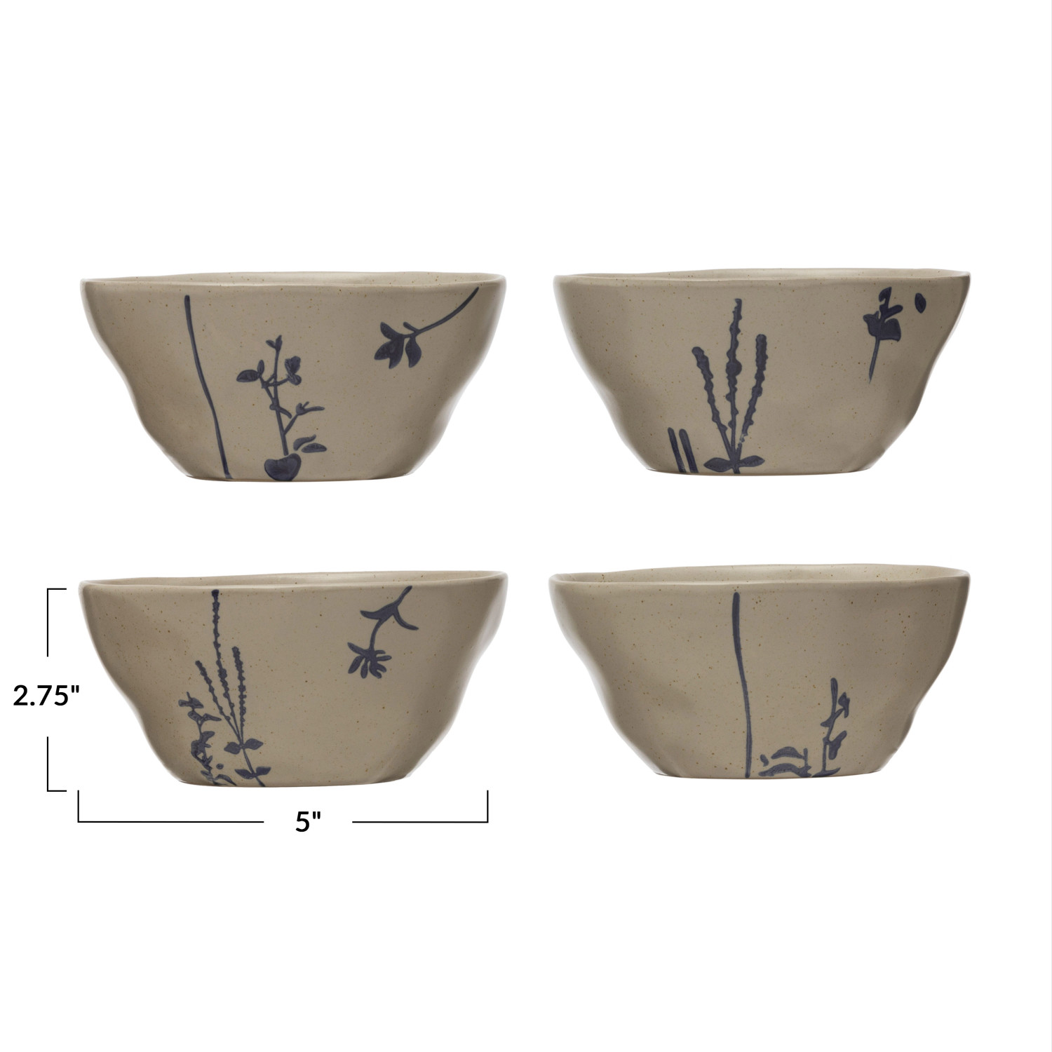 Catalog Name: 5" Round x 2-3/4"H Hand-Stamped Stoneware Bowl w/ Botanicals, Antique White & Blue, 4 Styles