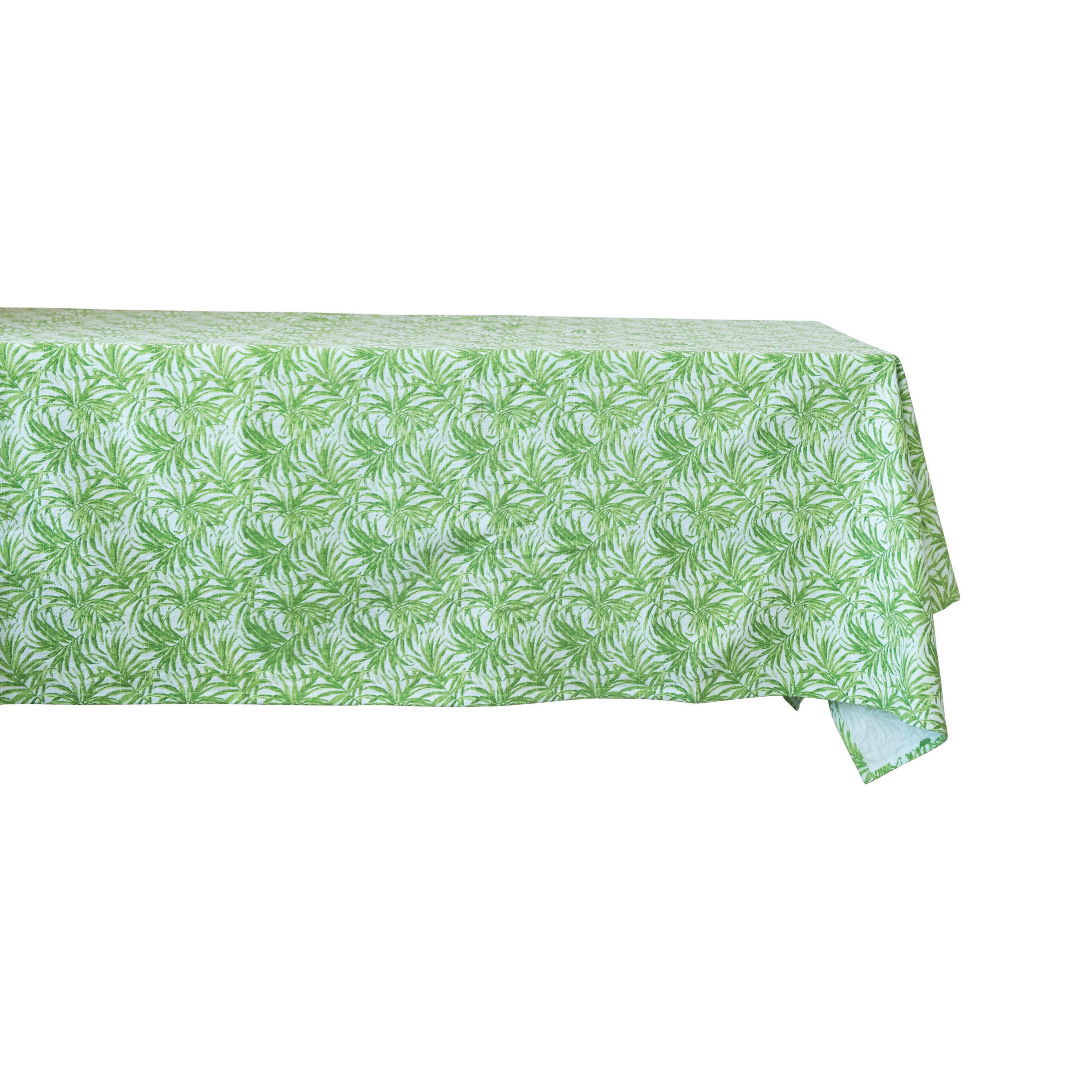 Green cotton tablecloth with palm leaf pattern; 30 Degree Wash, Do Not Bleach, Tumble Dry Low, Do Not Dry Clean, Medium Iron. Add a touch of style to any kitchen or dining space with this whimsical tablecloth. Made from 100% cotton. Curate a space that reflects your unique sense of style with intentionally designed home décor.