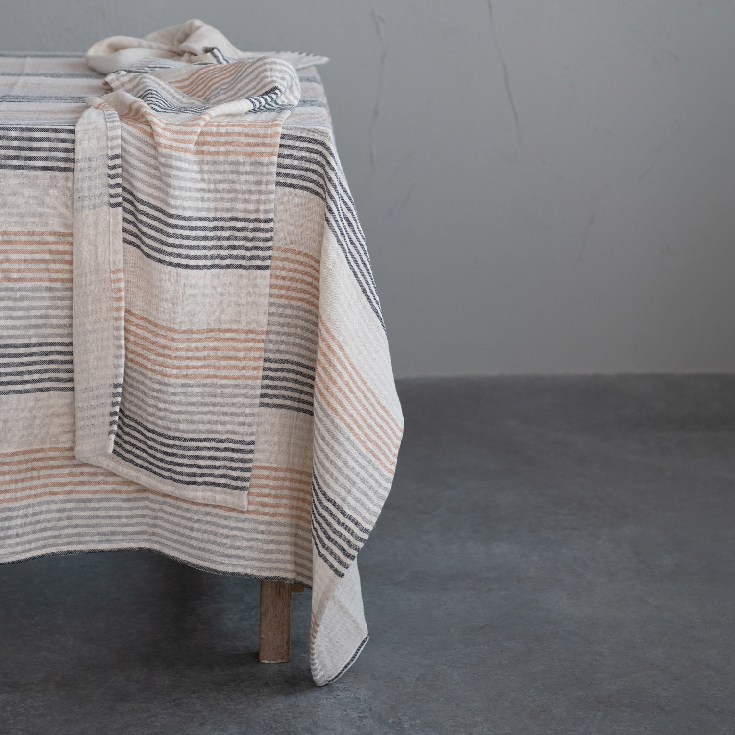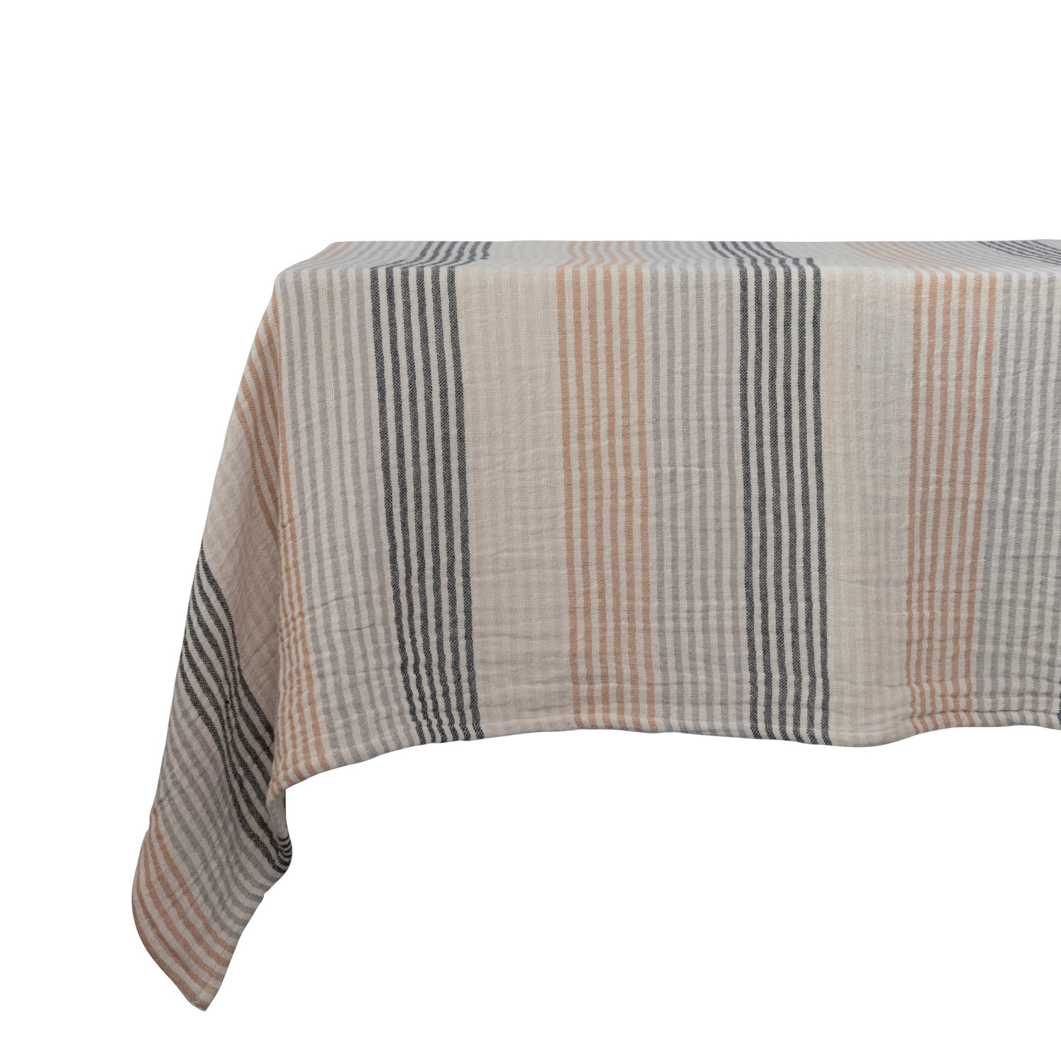 This whimsical tablecloth showcases yarn dyed cotton double cloth with stripes. Machine Wash Warm, Gentle Cycle, Do Not Bleach, Tumble Dry Low, Warm Iron if Needed.