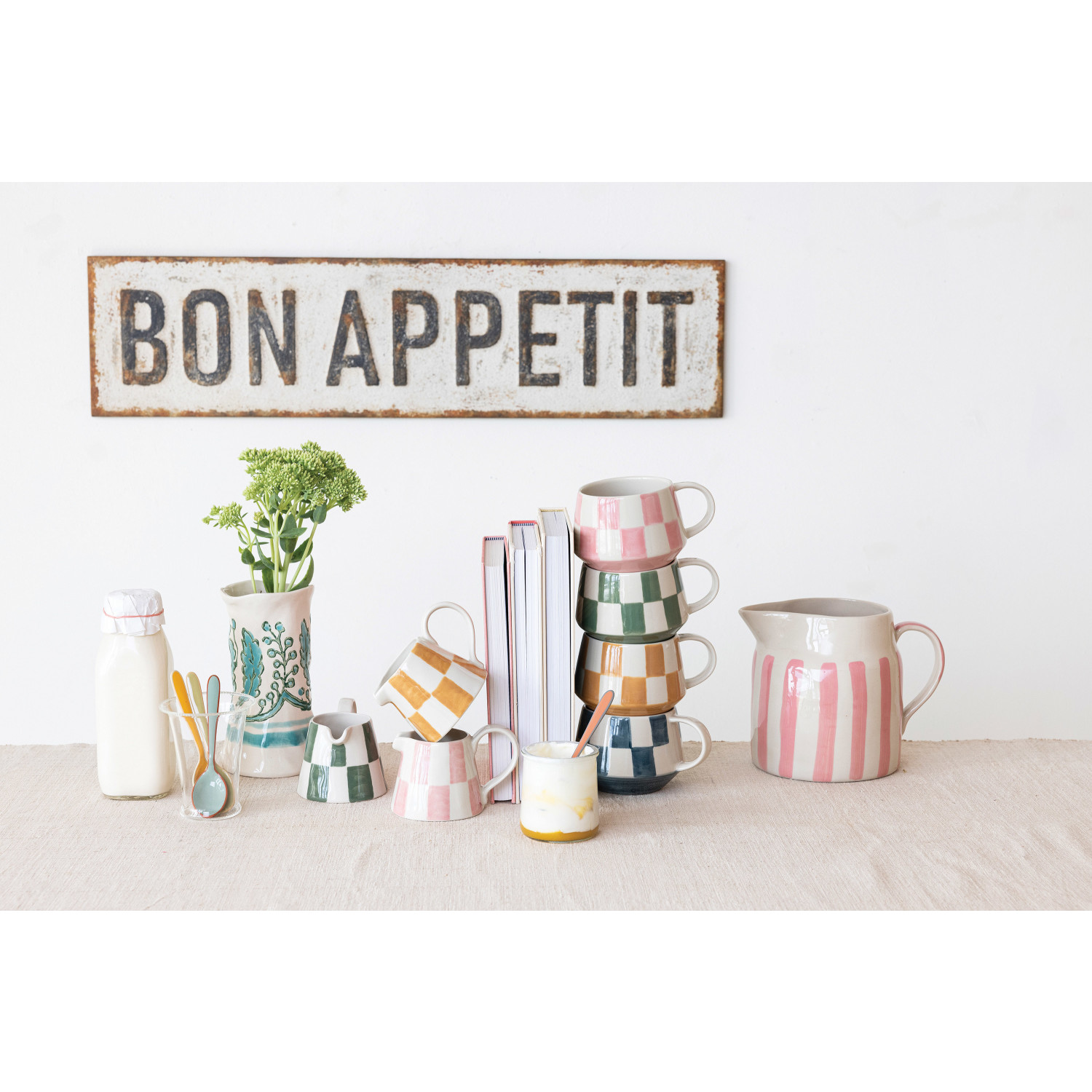 Catalog Name: 3-1/4" Round x 3-1/4"H 10 oz. Hand-Painted Stoneware Mug w/ Check Pattern, 4 Colors