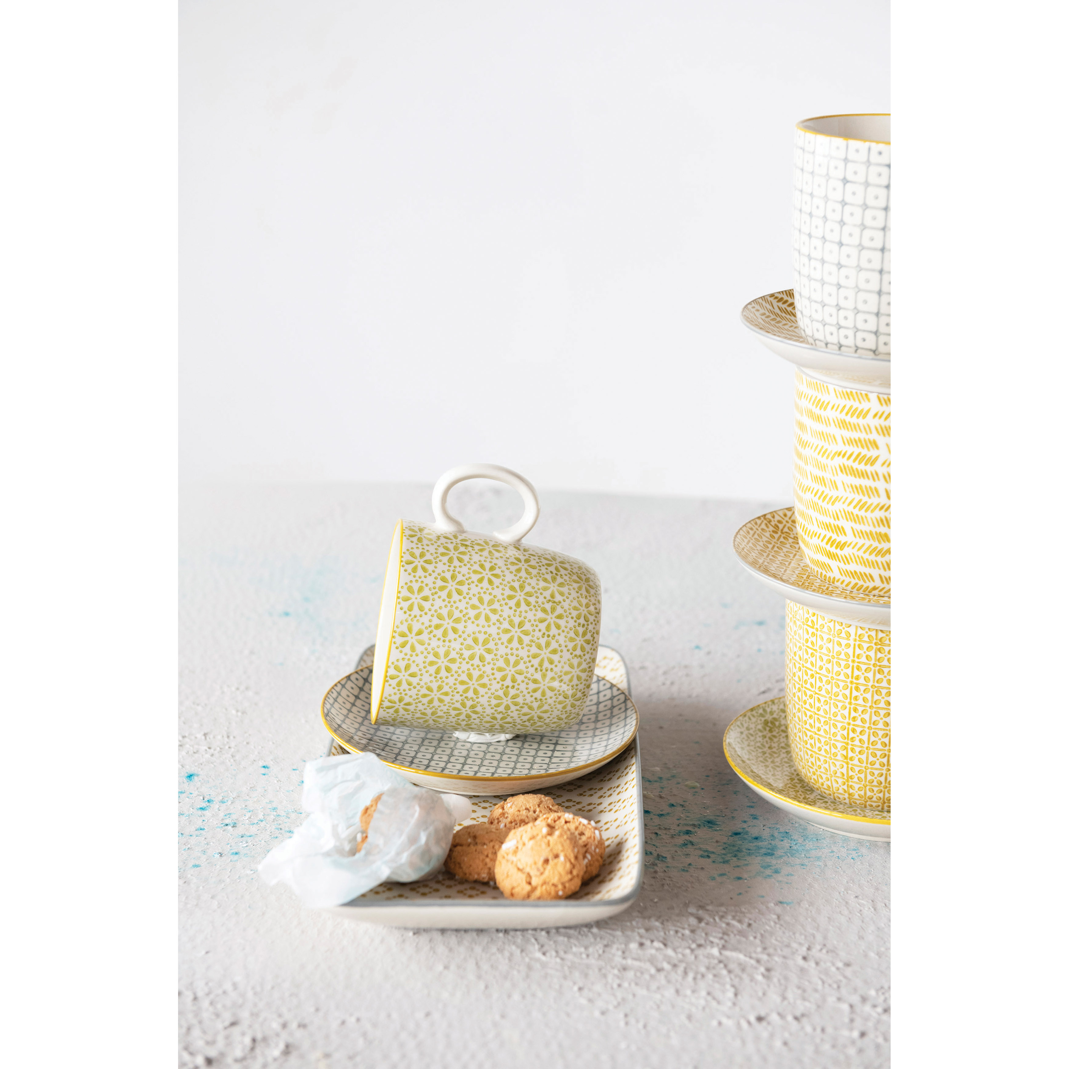 Hand-stamped stoneware planter in mustard finish. Add a whimsical touch to any dining or gathering space with this intricately hand-stamped platter. Made from 100% stoneware. Curate a space that reflects your unique sense of style with intentionally designed home décor.