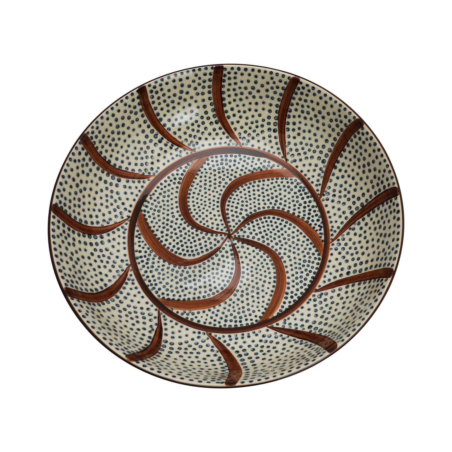 Catalog Name: 13-1/2" Round x 3-1/2"H Hand-Painted Stoneware Serving Bowl w/ Pattern, Brown, Blue & Cream Color