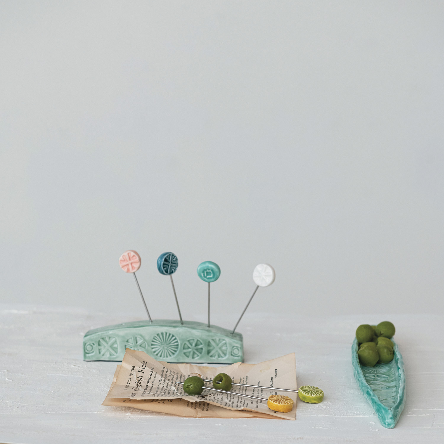 Catalog Name: 12"L x 1-3/4"W Hand-Painted Debossed Stoneware Olive Dish, Aqua ©