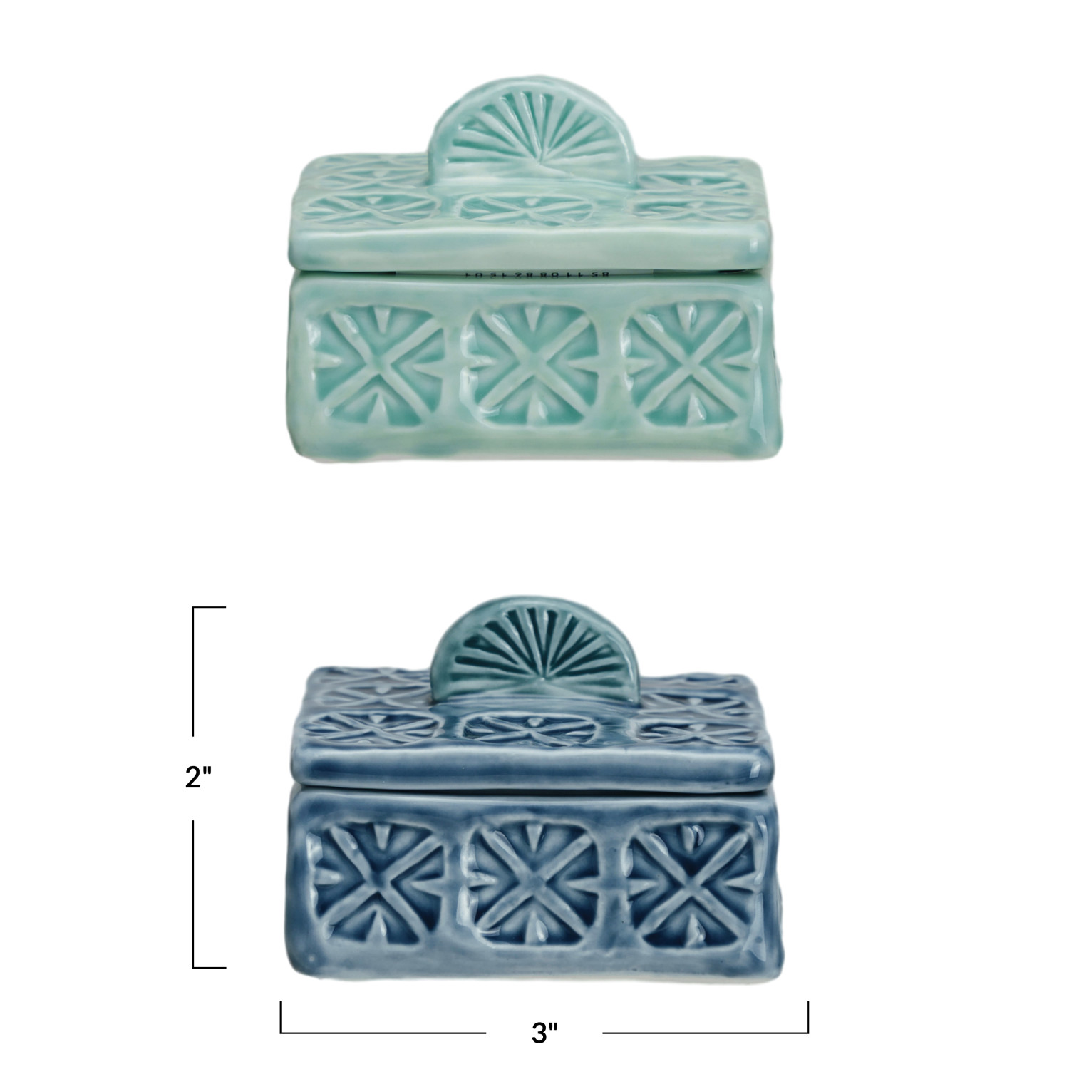 Catalog Name: 3" Square x 2"H Hand-Painted Debossed Stoneware Salt Cellar w/ Lid, 2 Colors ©