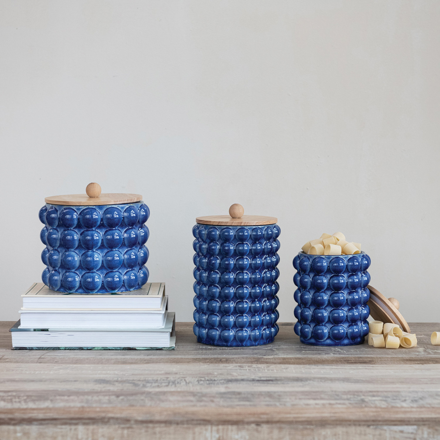 Catalog Name: 8-1/4" Round x 8-1/4"H Stoneware Canister w/ Raised Dots & Wood Lid, Reactive Glaze, Blue & Natural (Each One Will Vary)