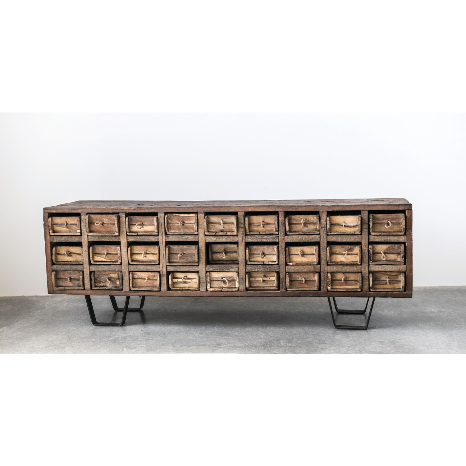 The organizer's dream comes true with this found brick mould chest. With 27 drawers, there is room to sort items and have everything neat and tidy. Fun rope pulls serve for handles adding to the unique nature of this amazing piece. Perfect for crafts, sewing materials, office or general household items, it will be a family favorite for years to come.