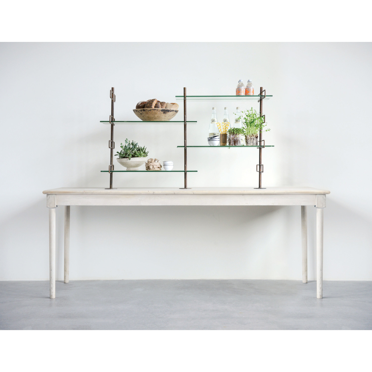 This table is 83.75” long and has its own set of shelves on top. The shelves can be set in groups of two for a deep shelf or spread out evenly to make more shelves that are narrow. Just be sure to distribute the weight evenly.