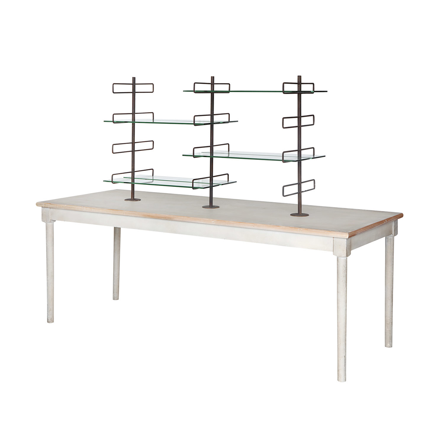 Catalog Name: 83-3/4"L x 31-1/2"W x 63-3/4"H Wood Vintage Reproduction Table w/ 4 Metal & Glass Shelves, Whitewashed, KD, Truck Ship