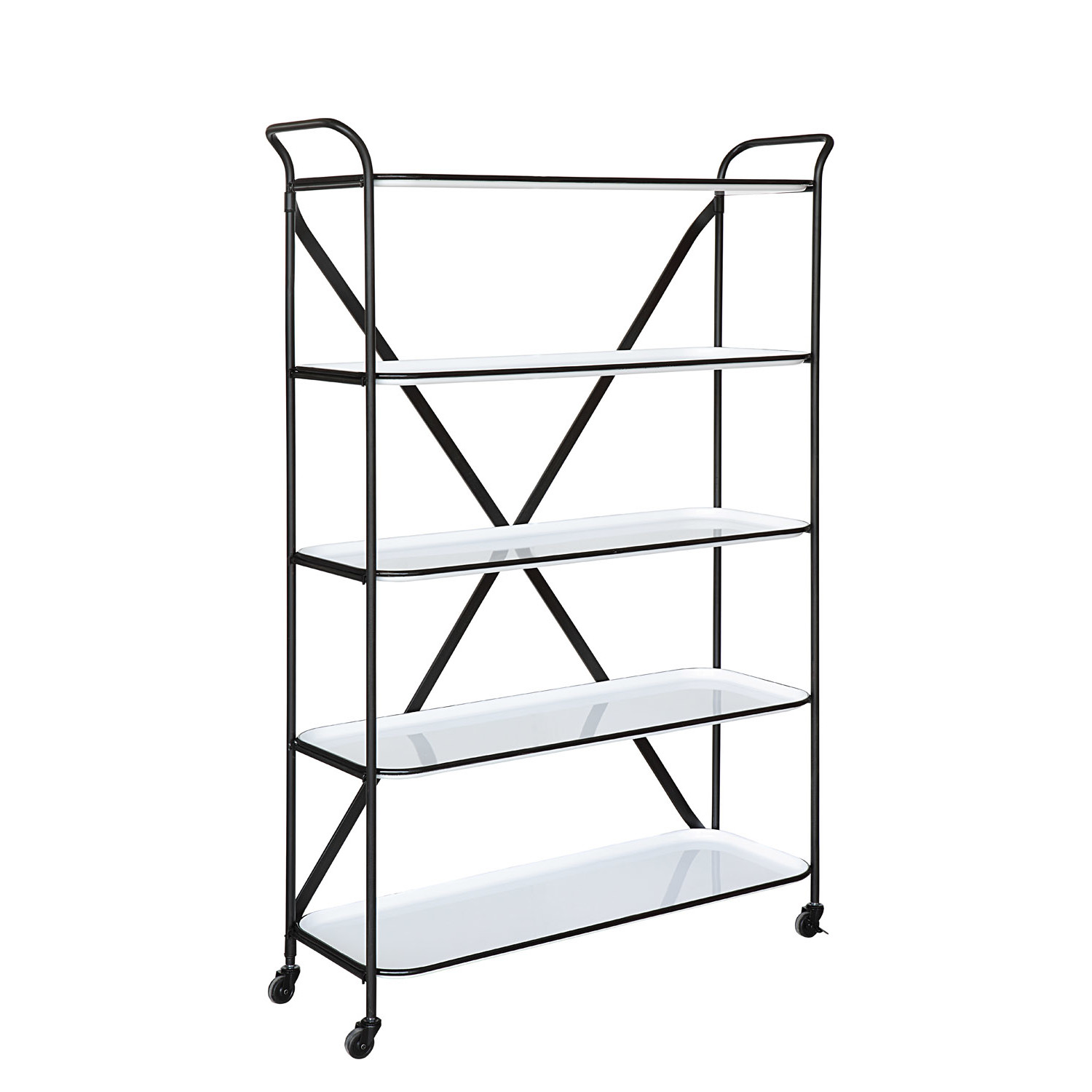 Never again need more shelf space! This wonderful unit has 5 large shelves. The shelves are white with tray shape edges for holding items inside. An additional bonus is the caster wheels for freedom to move these shelves where needed.