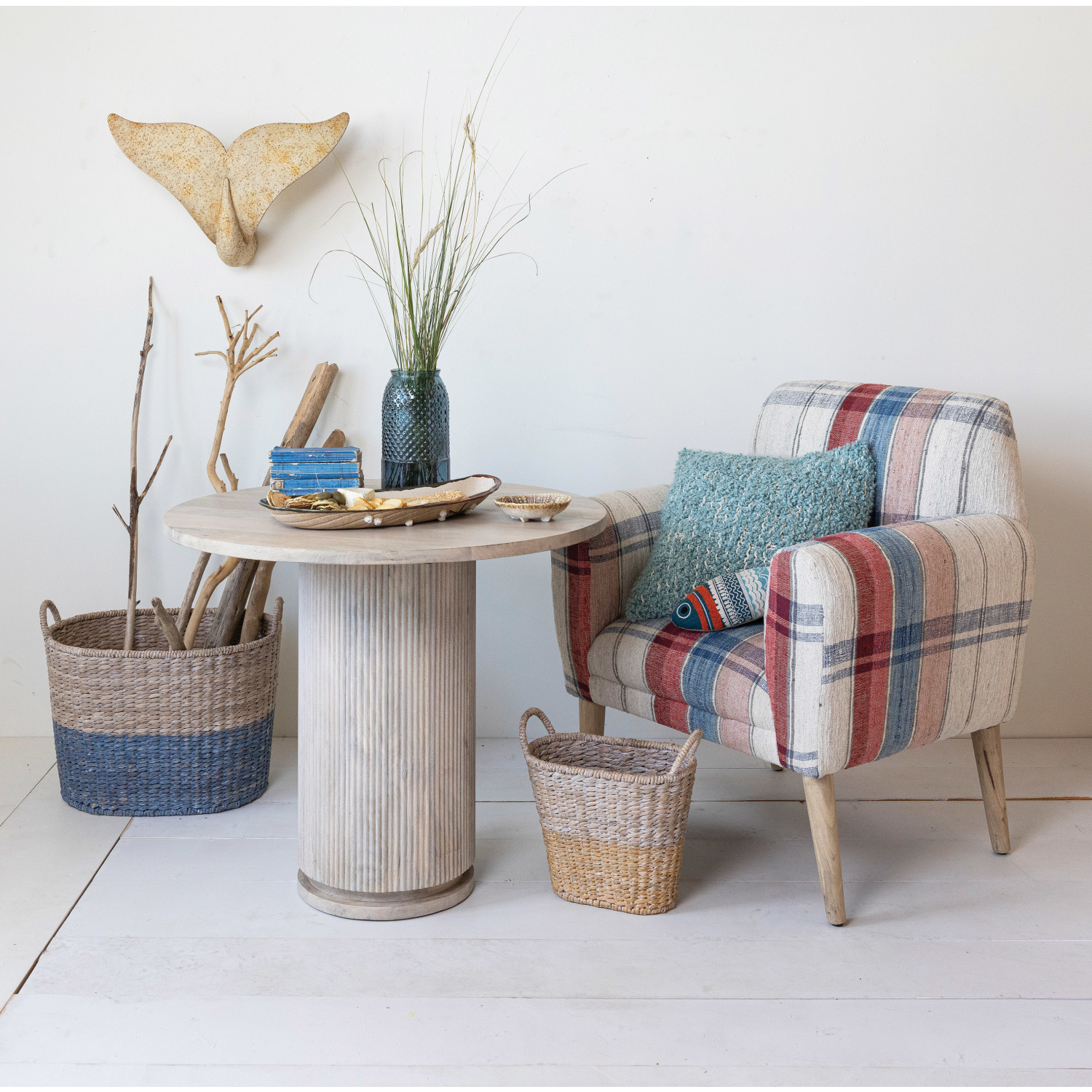 Catalog Name: 33"W x 28"D x 38"H Woven Cotton Upholstered Arm Chair w/ Mango Wood Legs & Nail Heads, Multi Color Plaid & Bleached, KD, Truck Ship