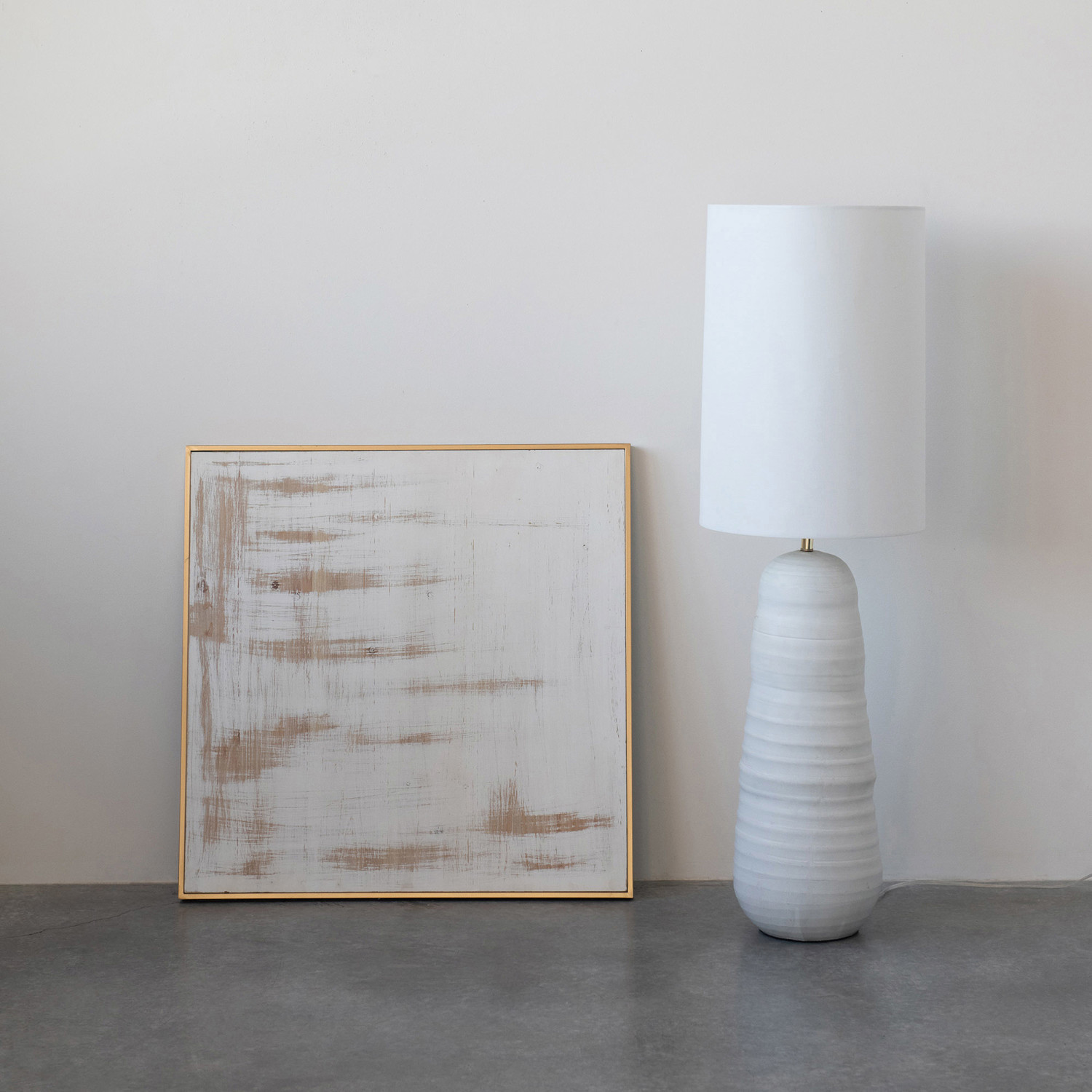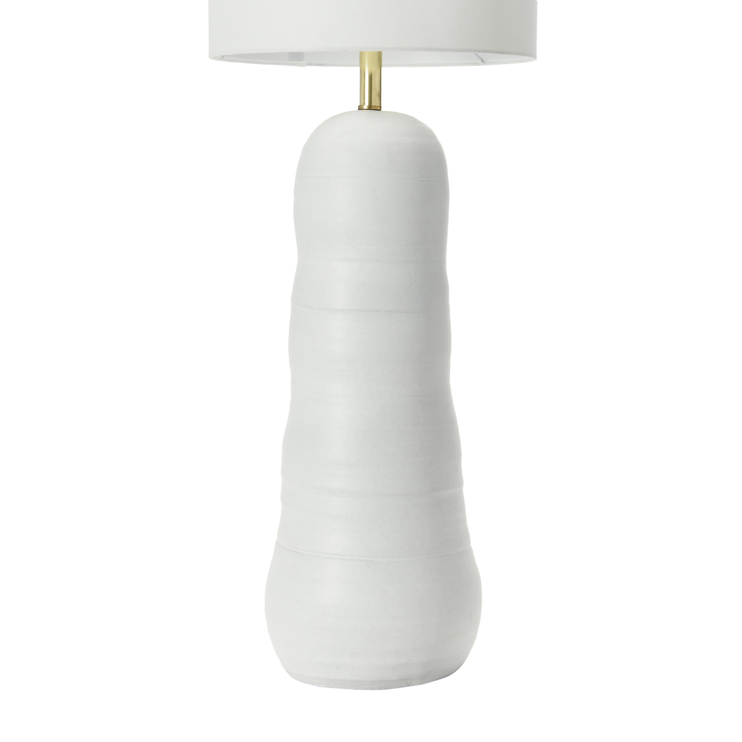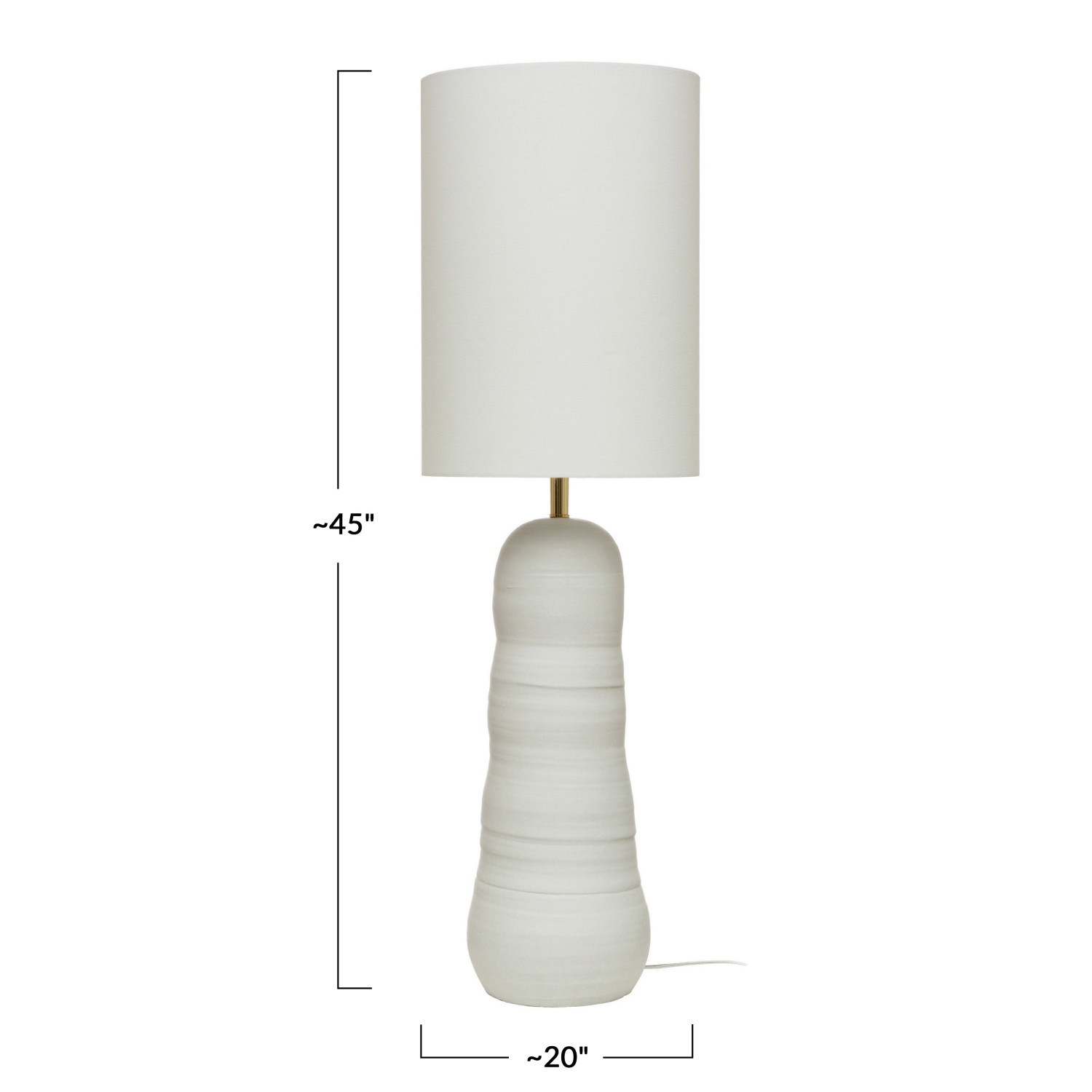 Add some style and personality to the space with this matte white stoneware floor lamp that showcases a matte white stoneware base with a naturally variating reactive glaze, topped with an oversized white linen cylindrical shade. Features a stoneware base that has a round shape and a matte white reactive glaze that creates a stunning and unique effect. The matte white reactive glaze adds a touch of elegance and shine to the lamp, while the oversized white linen cylindrical shade creates a cozy and inviting light that complements the white base. This floor lamp is suitable for any room that needs some extra sophistication and style, such as the living room, bedroom, office, or any other area. It can also be a great gift for anyone who loves contemporary, minimalist, or Scandinavian design. This floor lamp requires one 60-watt bulb (not included), and the lamp is equipped with a rotary switch on the base for easy on and off. It measures 14 inches round x 47 inches tall, and the cord length is 7 feet. Add this matte white stoneware floor lamp to the home and enjoy its beauty and functionality.