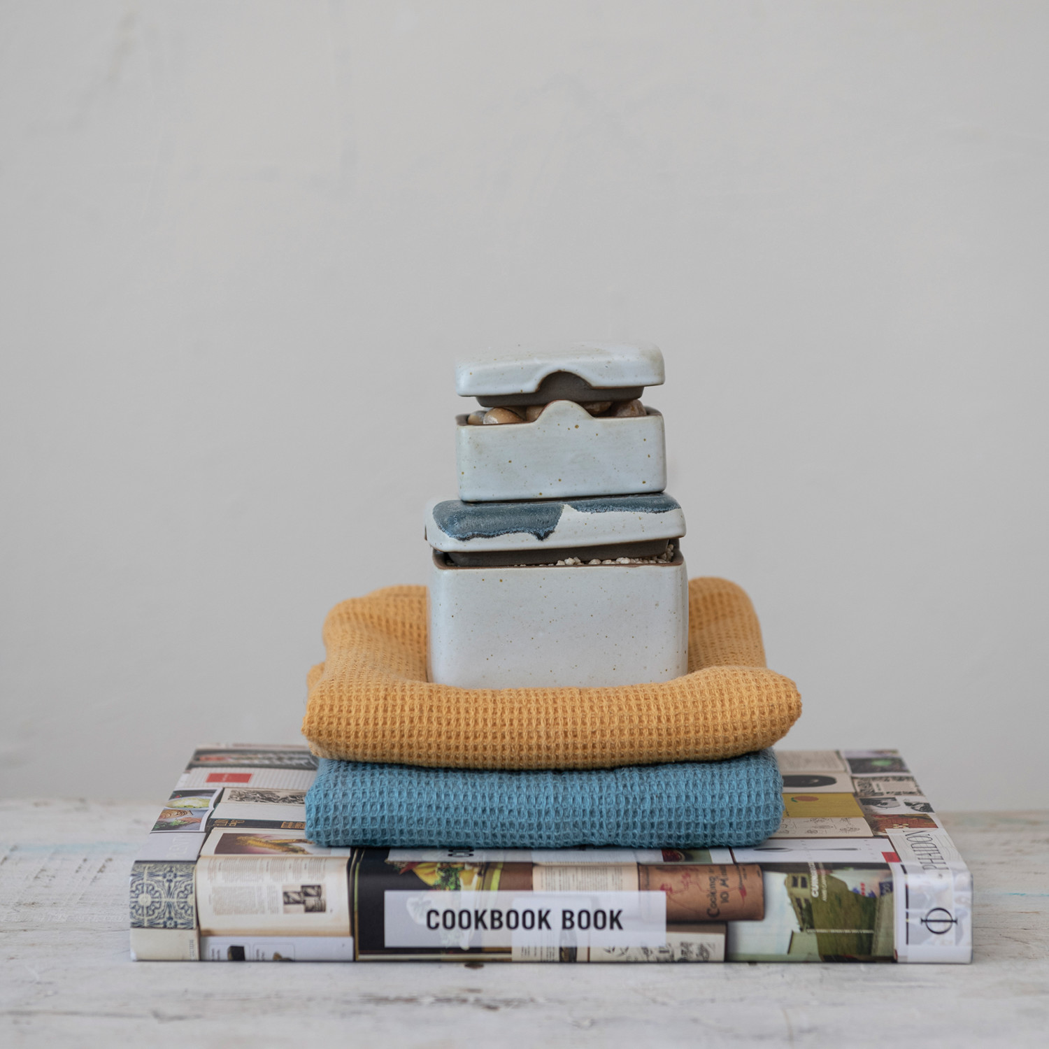 Catalog Name: 3-1/4" Square x 1-3/4"H Stoneware Box w/ Lid, Reactive Glaze, White (Each One Will Vary)