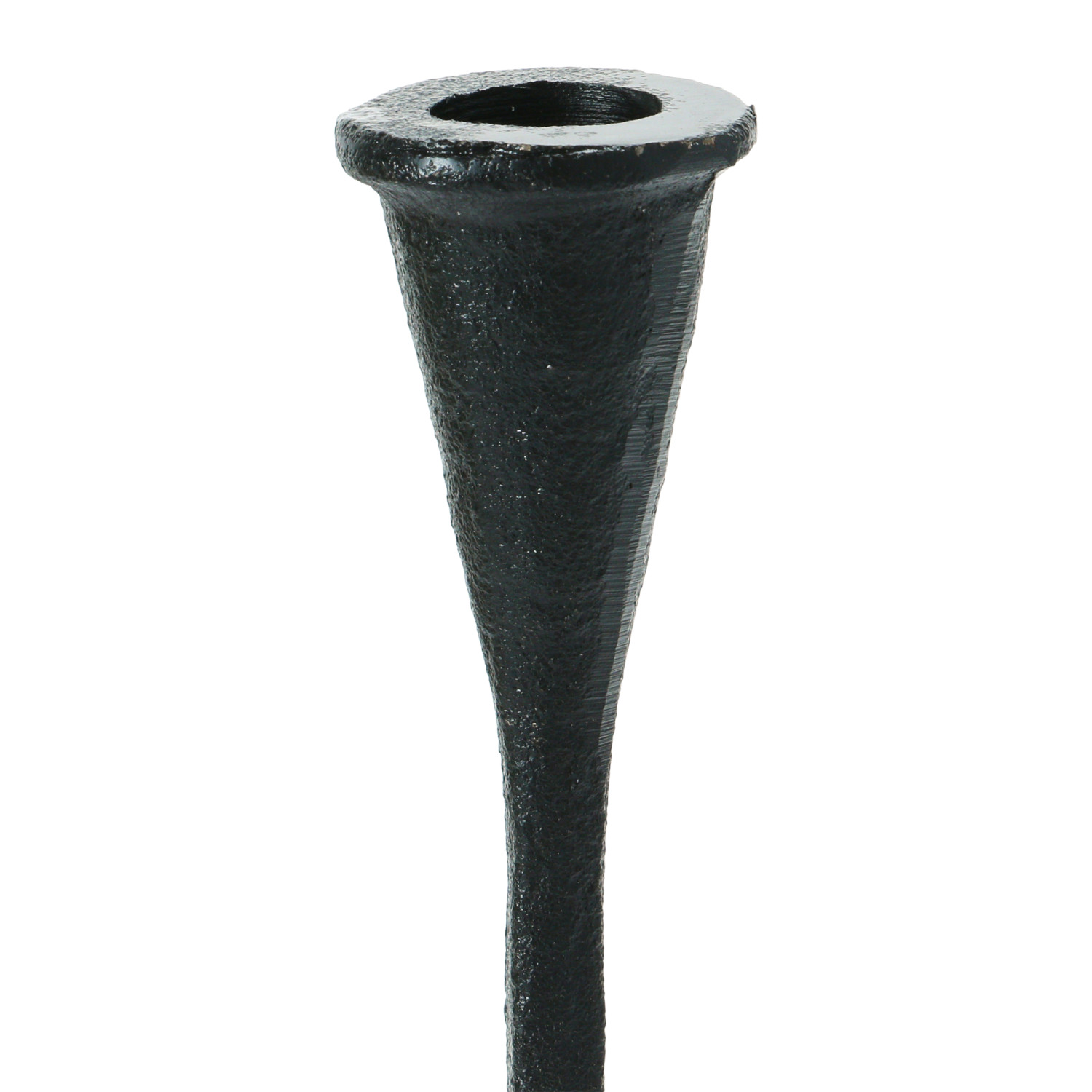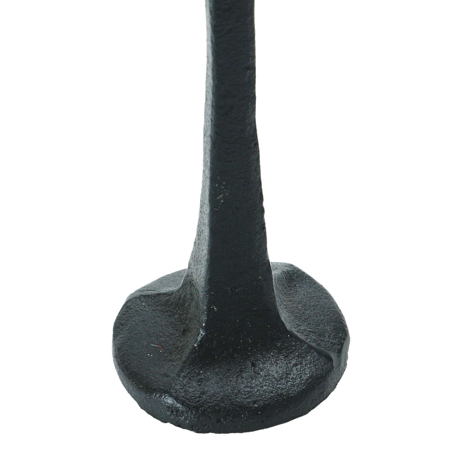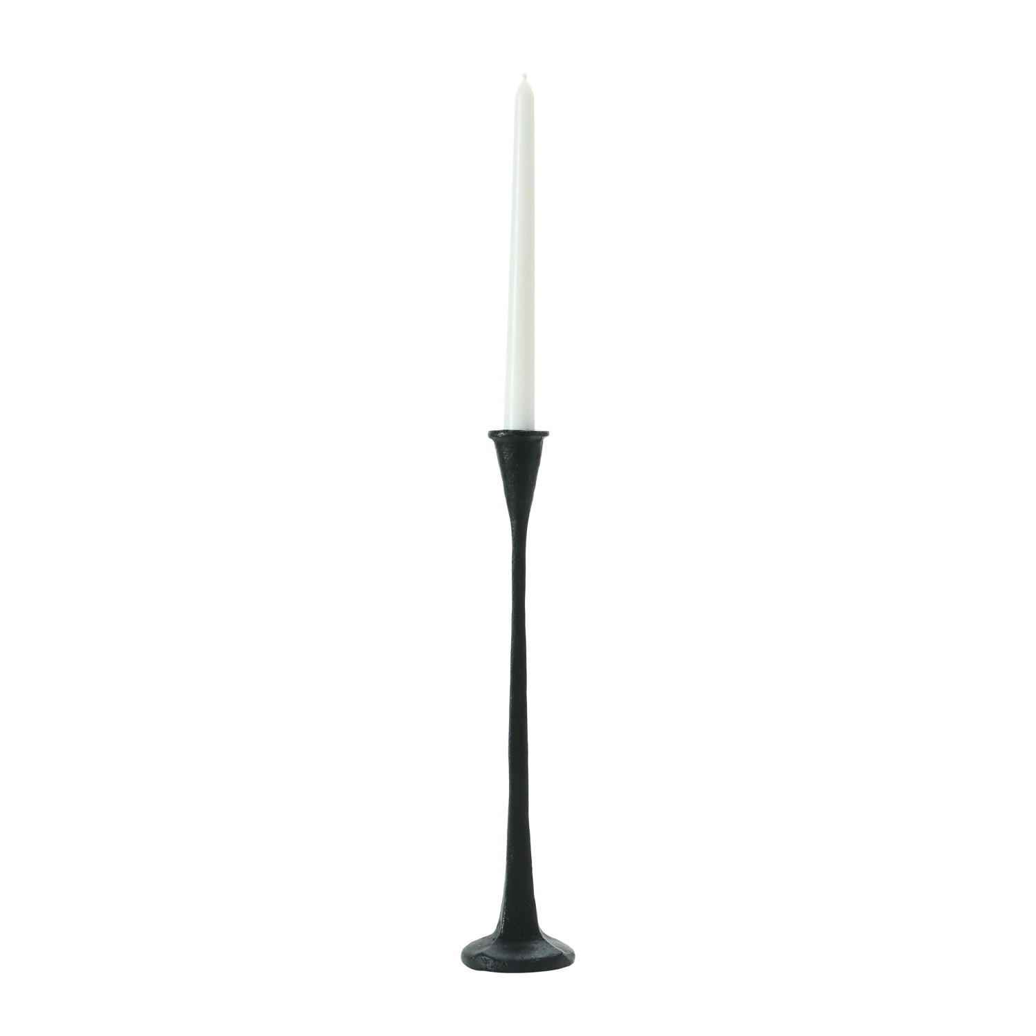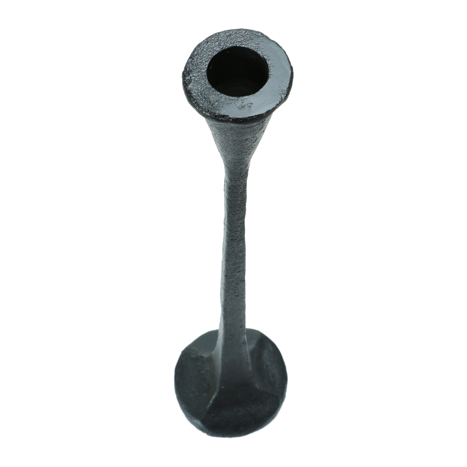 Elevate the space with this black cast metal taper holder. This taper holder is not a run-of-the-mill candlestick. It is made of durable cast metal with a black low-luster finish that gives it a sleek and sophisticated look. It has a slightly textured appearance that adds some rustic flair and personality. It can hold any standard wax or LED taper candle, creating a warm and cozy ambiance in the home. Place it on any surface, such as a mantel, a table, or a sideboard, and create a beautiful focal point. Mix and match it with other taper holders of different sizes and shapes for a more dynamic and eclectic look. This taper holder is a versatile piece that can suit any style of home decor, from trendy and rustic to eclectic and modern. It is easy to clean and maintain; just wipe it with a dry cloth. It measures 3 inches in diameter and 14.25 inches in height. This black cast metal taper holder is a must-have for home.
