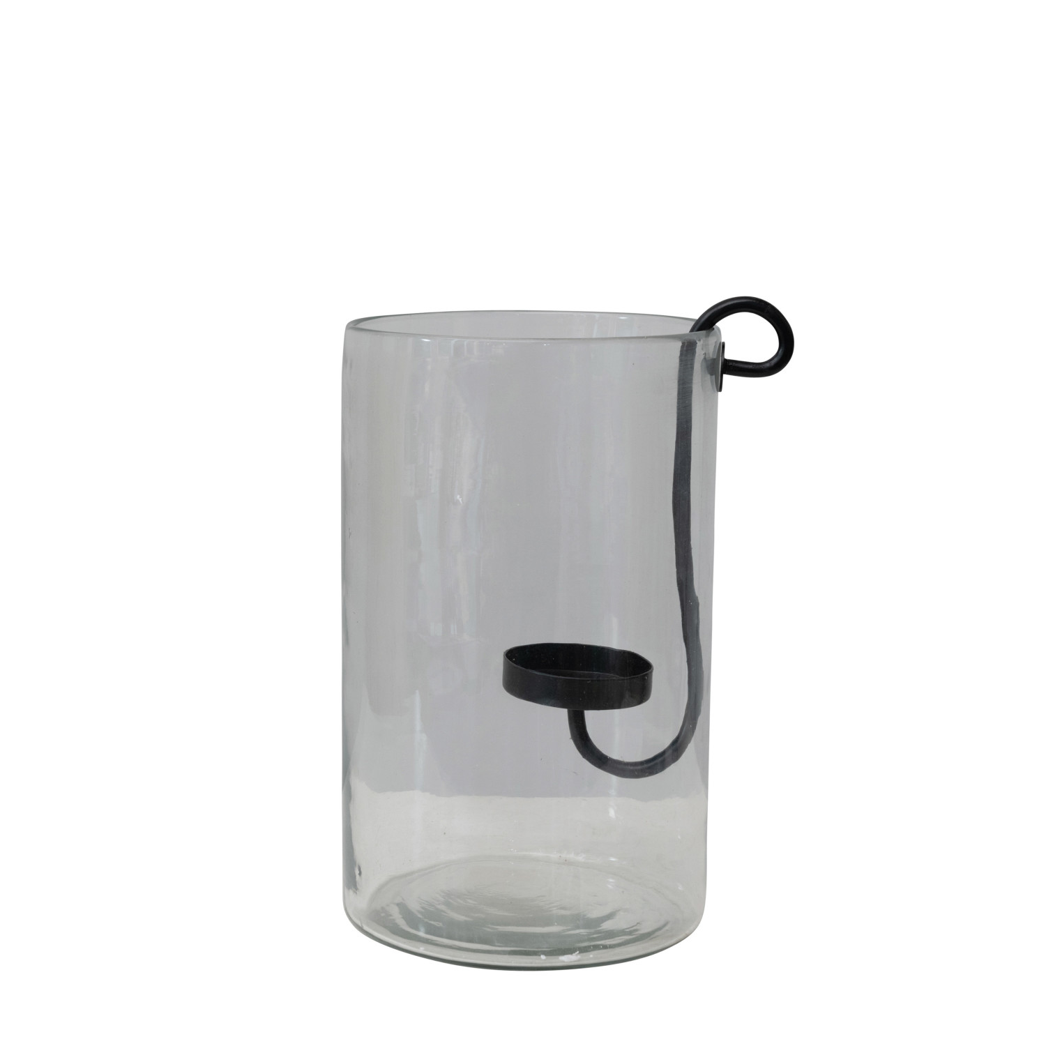 This minimalist glass hurricane showcases a sleek, attached metal candleholder.