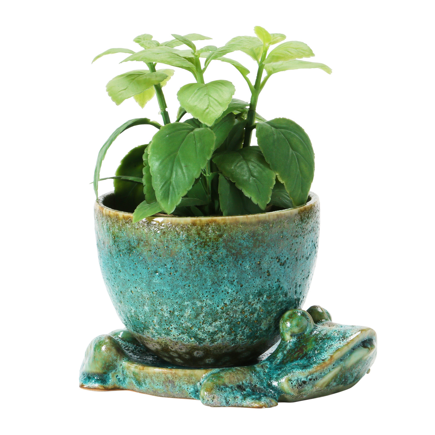 Catalog Name: 8-1/2"L x 6-1/4"W x 4-3/4"H Stoneware Planter w/ Frog Saucer, Reactive Glaze, Green, Set of 2 (Holds 5" Pot) (Each One Will Vary)