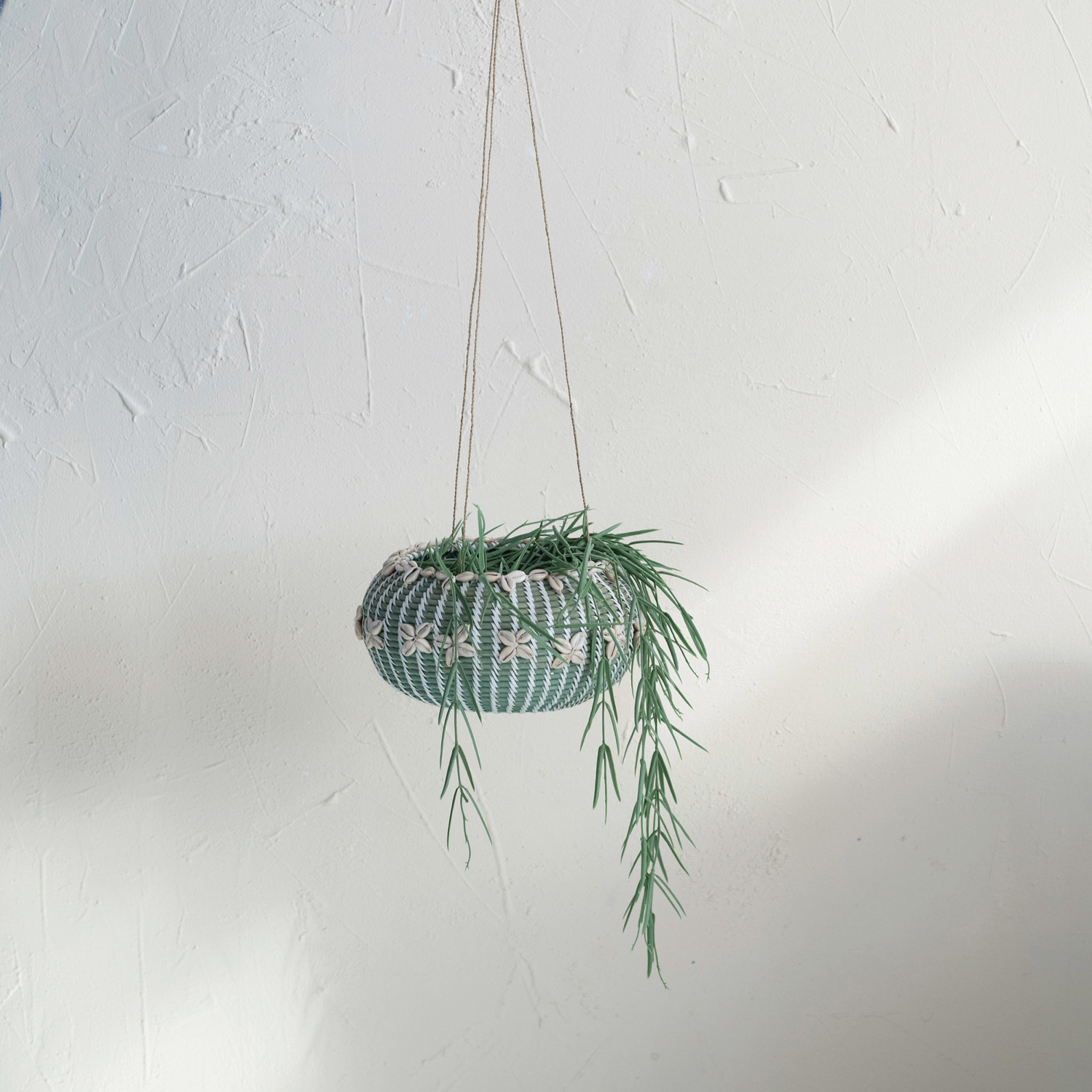 Hanging Hand-Woven Rattan Basket/Planter w/ Shells & Jute Hanger, Aqua
