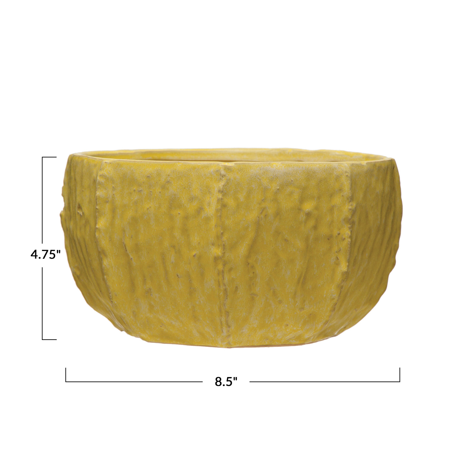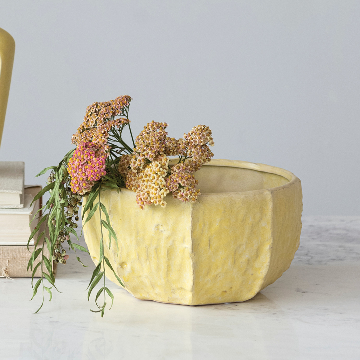This Stoneware Planter with Organically Shaped Detail, Yellow is a beautiful piece of home décor that can add style and functionality to any space. The planter is made of stoneware, a material that is known for its strength and versatility. The planter has an organically shaped detail that creates a natural and artistic impression. The planter has a yellow color that is bright and cheerful, making it easy to match with any color scheme. The planter is designed to hold a 6-inch pot, making it ideal for displaying small plants or flowers. The planter does not have drainage holes, so it is recommended to use a liner or a saucer to protect the surface underneath. The planter measures 8.5 inches in diameter and 4.75 inches in height, making it a cute and eye-catching addition to any room or surface. This is a perfect choice for anyone who wants to enhance their own space or give it as a gift to someone special. A lovely stoneware planter that features an organically shaped detail and a yellow color. Perfect for adding a touch of freshness and warmth to any modern, eclectic, or bohemian style home décor. Can be used as a vase for artificial flowers, or as a decorative piece on its own. Made of stoneware.