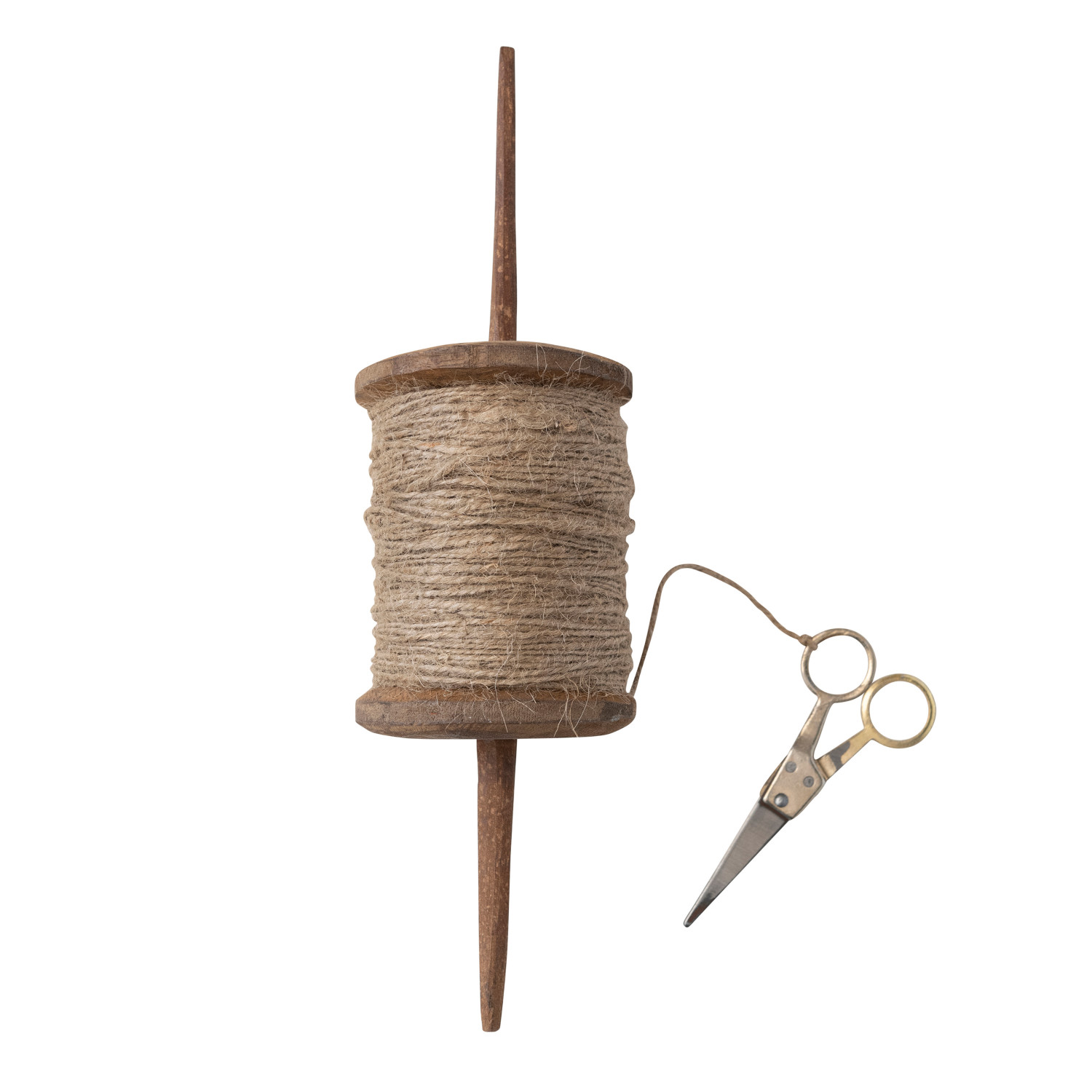 Catalog Name: 3-1/2" Round x 12"H Reclaimed Wood Spool w/ 2-3/4' Jute & 4"L Scissors, Natural & Brass Finish, Set of 2 (Each One Will Vary)