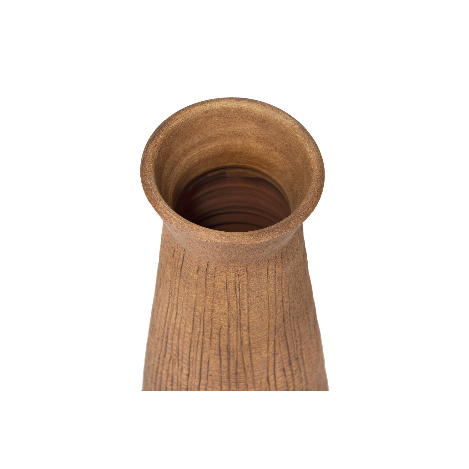 Vertical and horizontal lines are scored into the surface of this terracotta vase for a beautifully textured design. The dark sienna color makes it ideal for adding warmth to a room decor. Fill with a grouping of colorful fall florals or dried botanicals.