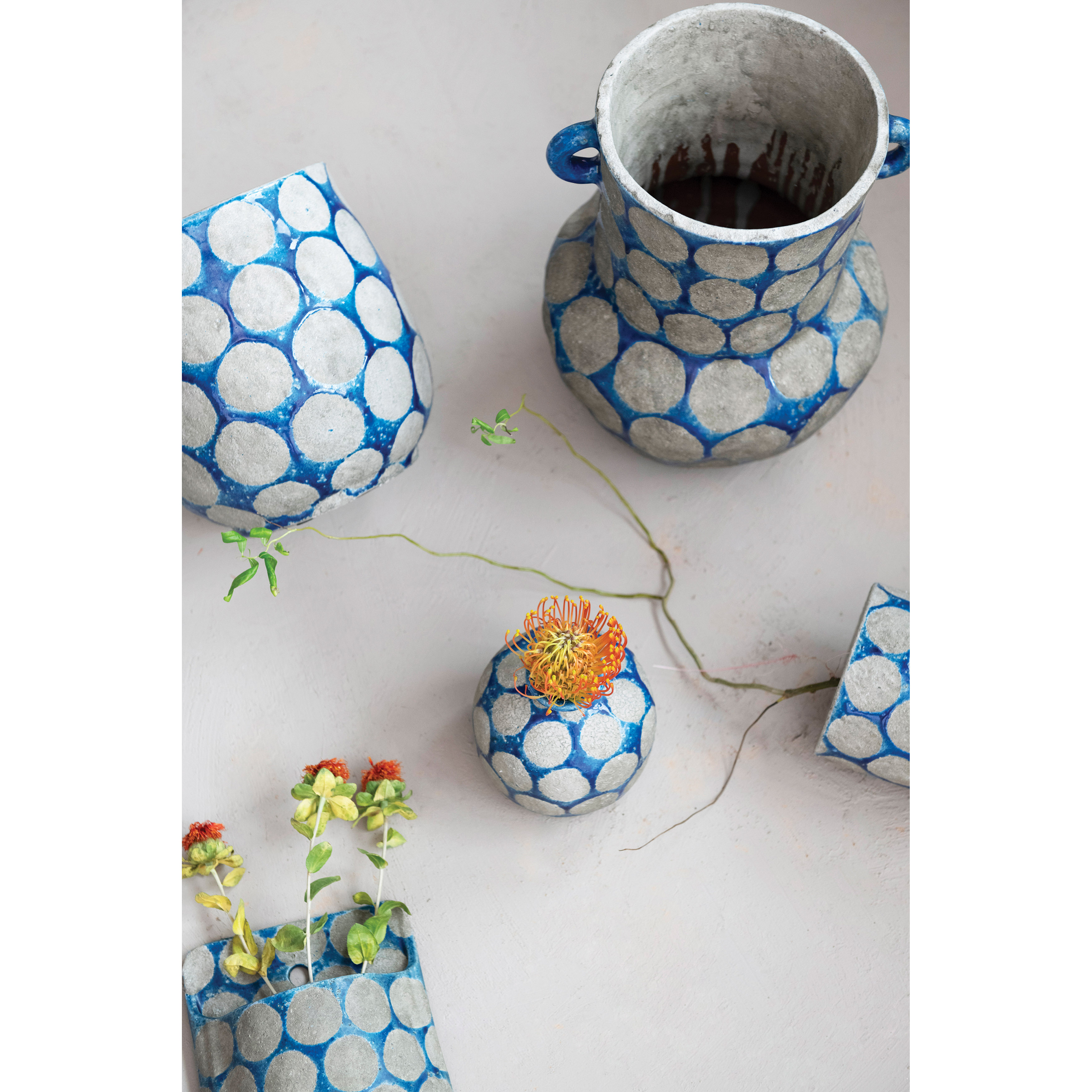 Add some color and style to the home with this terra-cotta vase that features a dark blue and cement color scheme and wax relief dots. This vase is perfect for adding a touch of coastal charm to any style of home décor, from nautical to tropical. The vase is designed for decorative purposes only and does not have drainage holes, so it is suitable for displaying dried or artificial flowers. Made of terra-cotta.