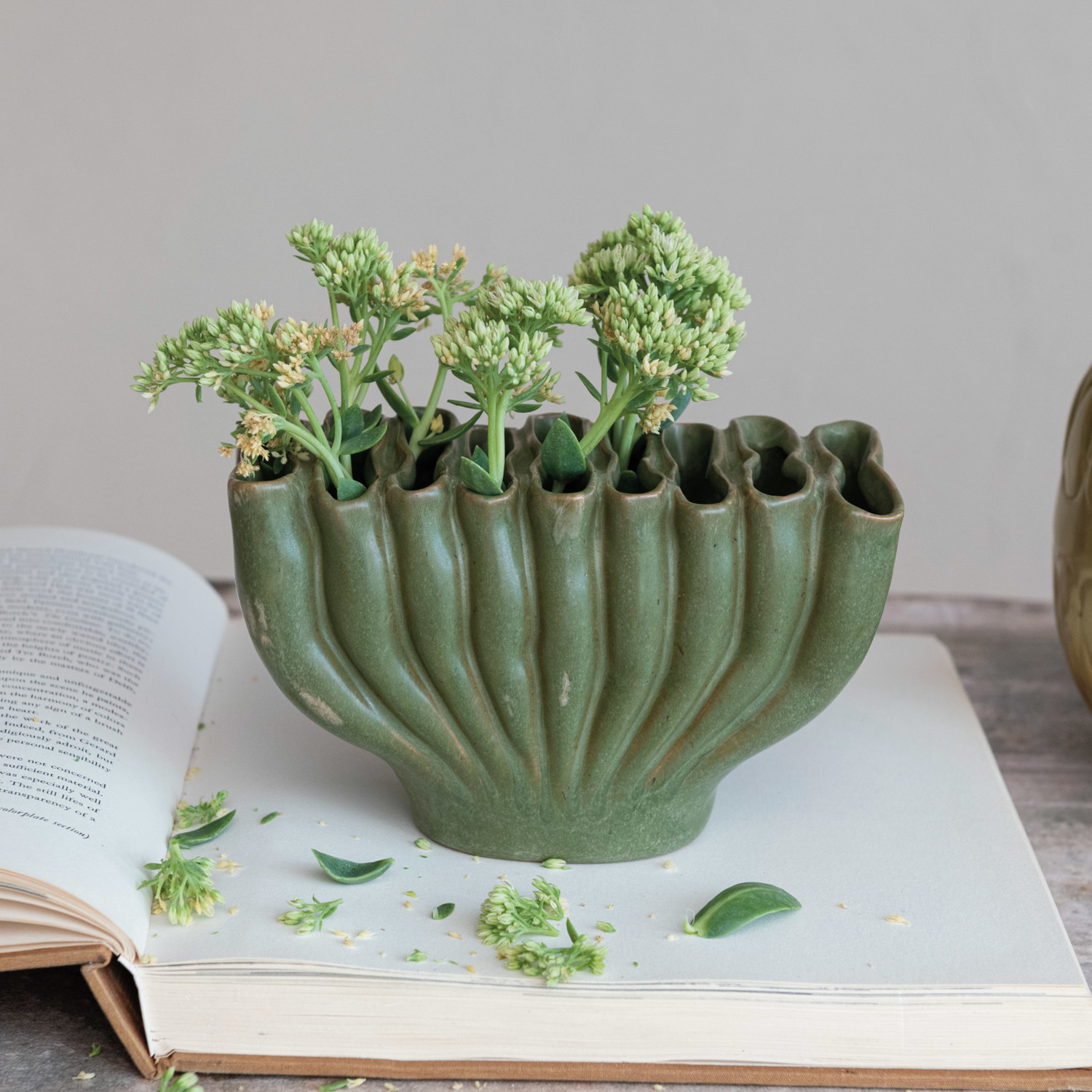 Catalog Name: 8"L x 4"W x 4-3/4"H Stoneware Sculptural Vase w/ 9 Sections, Reactive Glaze, Green (Each One Will Vary)