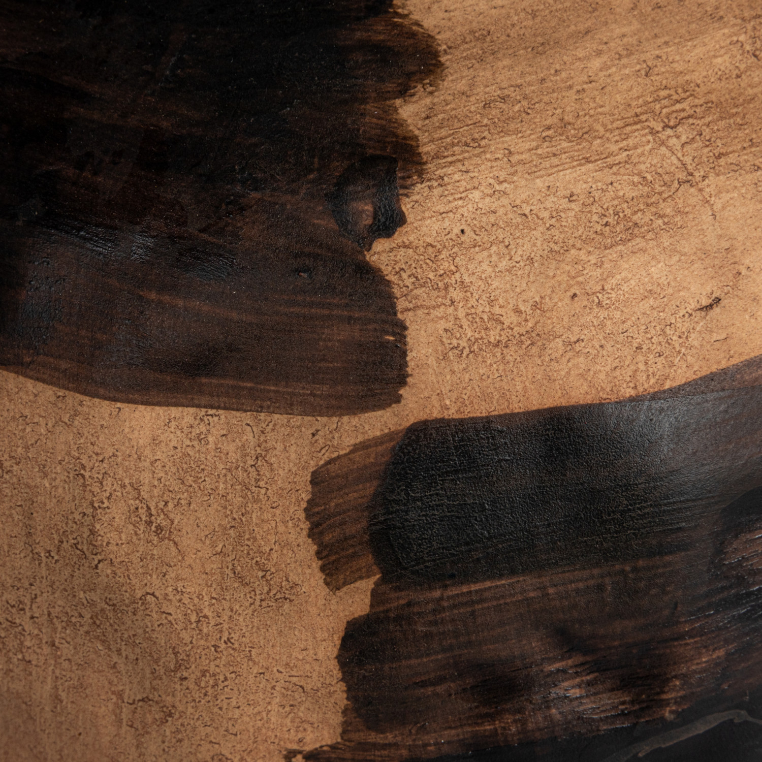 This round stoneware vase with a hand-painted design and black and cream reactive glaze is a stylish and artistic home accessory. Made of stoneware, fired at high temperatures, it has a round shape and wide opening. The hand-painted design contrasts with black and cream colors, creating a chic and modern look. The reactive glaze creates a smooth, shiny surface with a unique color and pattern. This vase can hold fresh or artificial flowers, plants, or branches, or serve as a decorative accent. It can be placed in any room of the house, creating an elegant space. Suitable for farmhouse, French country, boho, or transitional styles, it adds character and sophistication to any space. Each vase will vary slightly in color and pattern due to the hand-painted design and reactive glaze process.