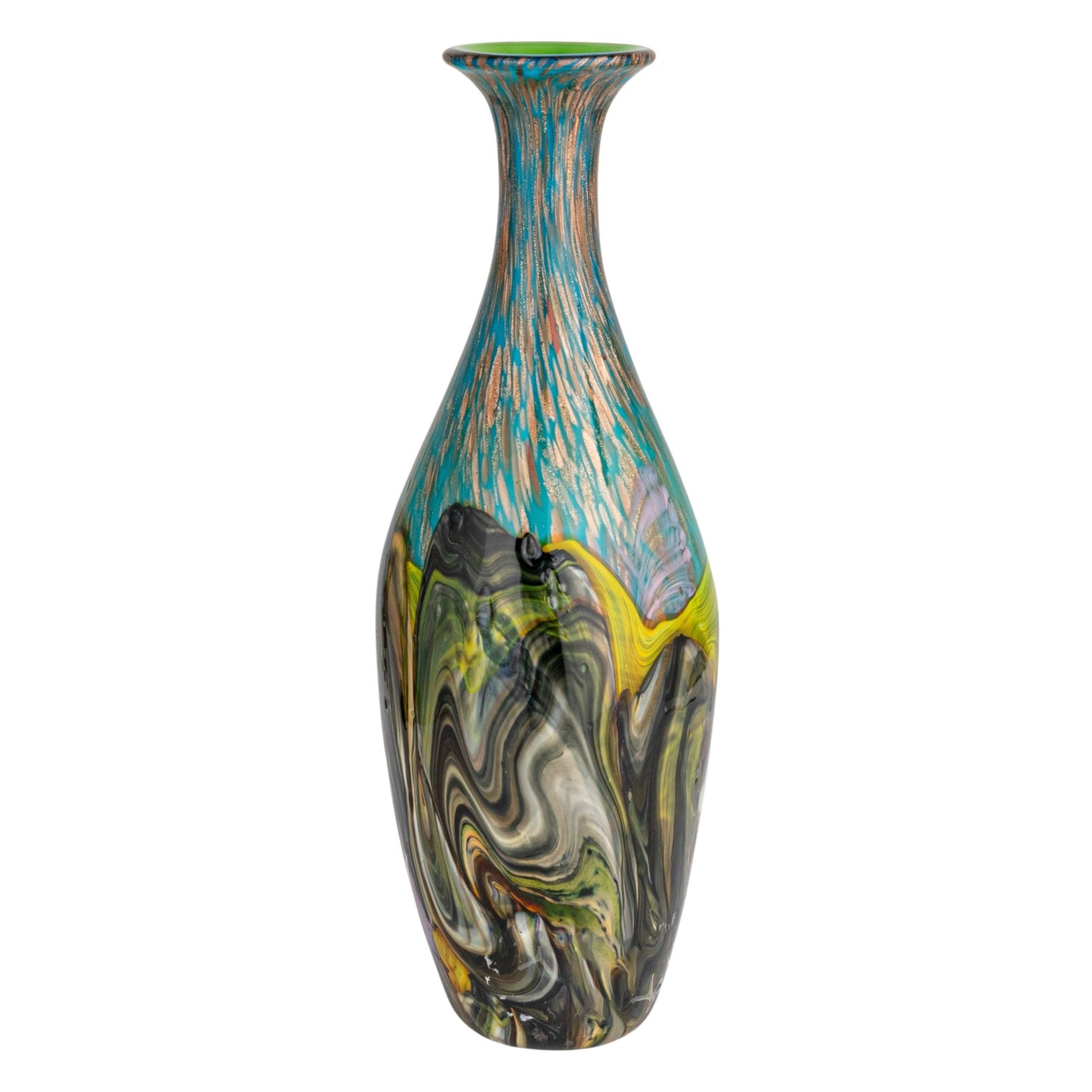 Catalog Name: 6-1/4" Round x 18-3/4"H Handmade Art Glass Vase w/ Gold Glitter, Multi Color, Truck Ship