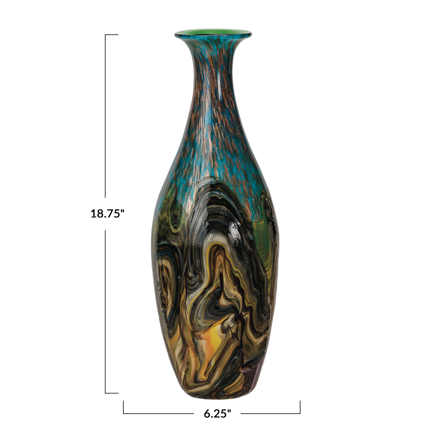 This handmade art glass vase is a testament to the beauty of skilled craftsmanship. The inclusion of gold glitter within the glass creates a shimmering effect that catches the light and the eye, making it a focal point in any setting. Its multi-colored design is reminiscent of a bohemian tapestry, while the narrow opening is ideal for displaying delicate floral arrangements. The vase's round form and considerable height offer a modern twist on traditional glassware, fitting seamlessly into various decor styles, from the laid-back coastal to the vibrant southwestern. It measures 6.25 inches in diameter and 18.75 inches in height, making it an elegant statement piece for any interior. It's not just a container for flowers; it's a piece of art that brings a touch of glamour and sophistication to the home.