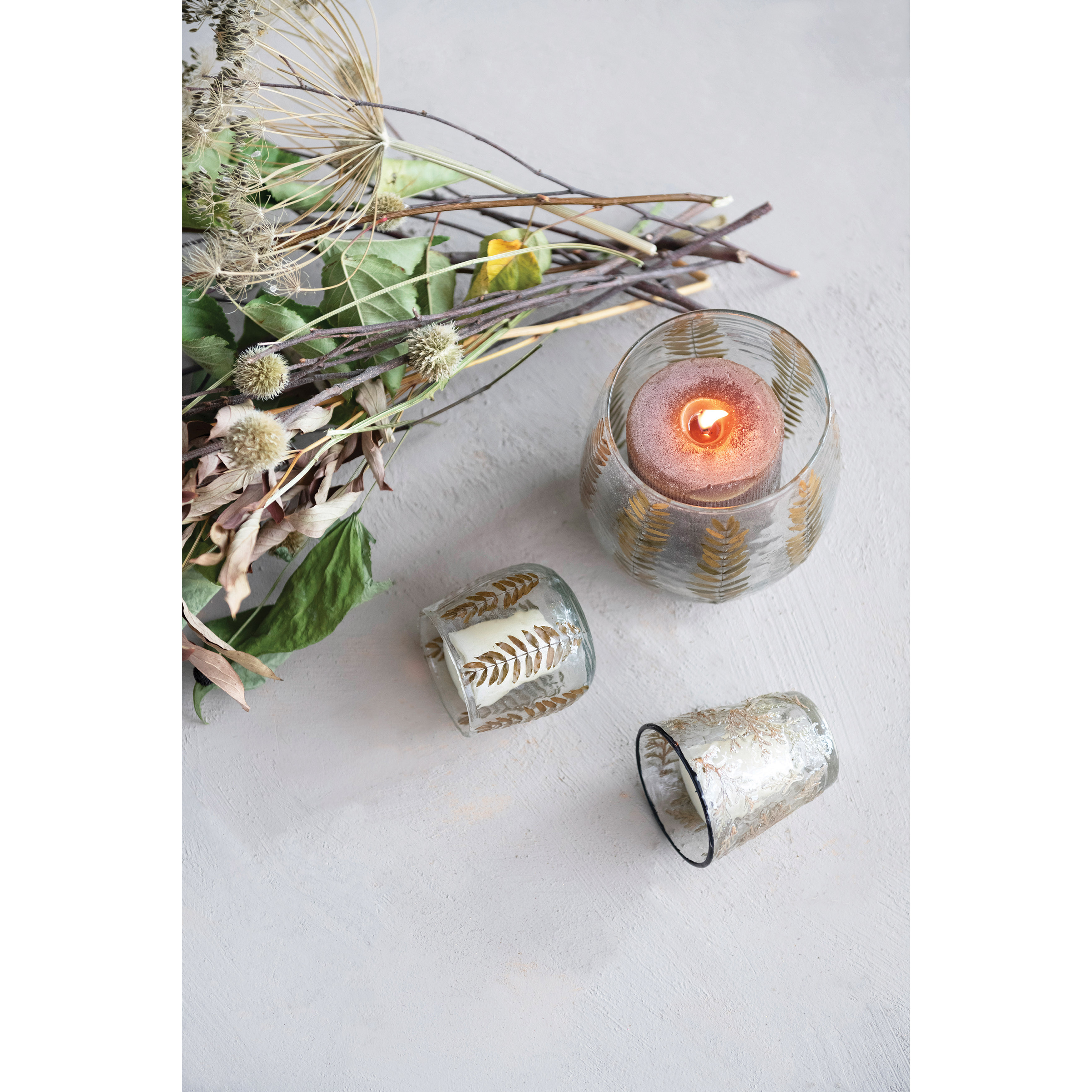 2-3/4" Round x 3"H Hand-Blown Glass Votive Holder with Embedded Natural Botanical