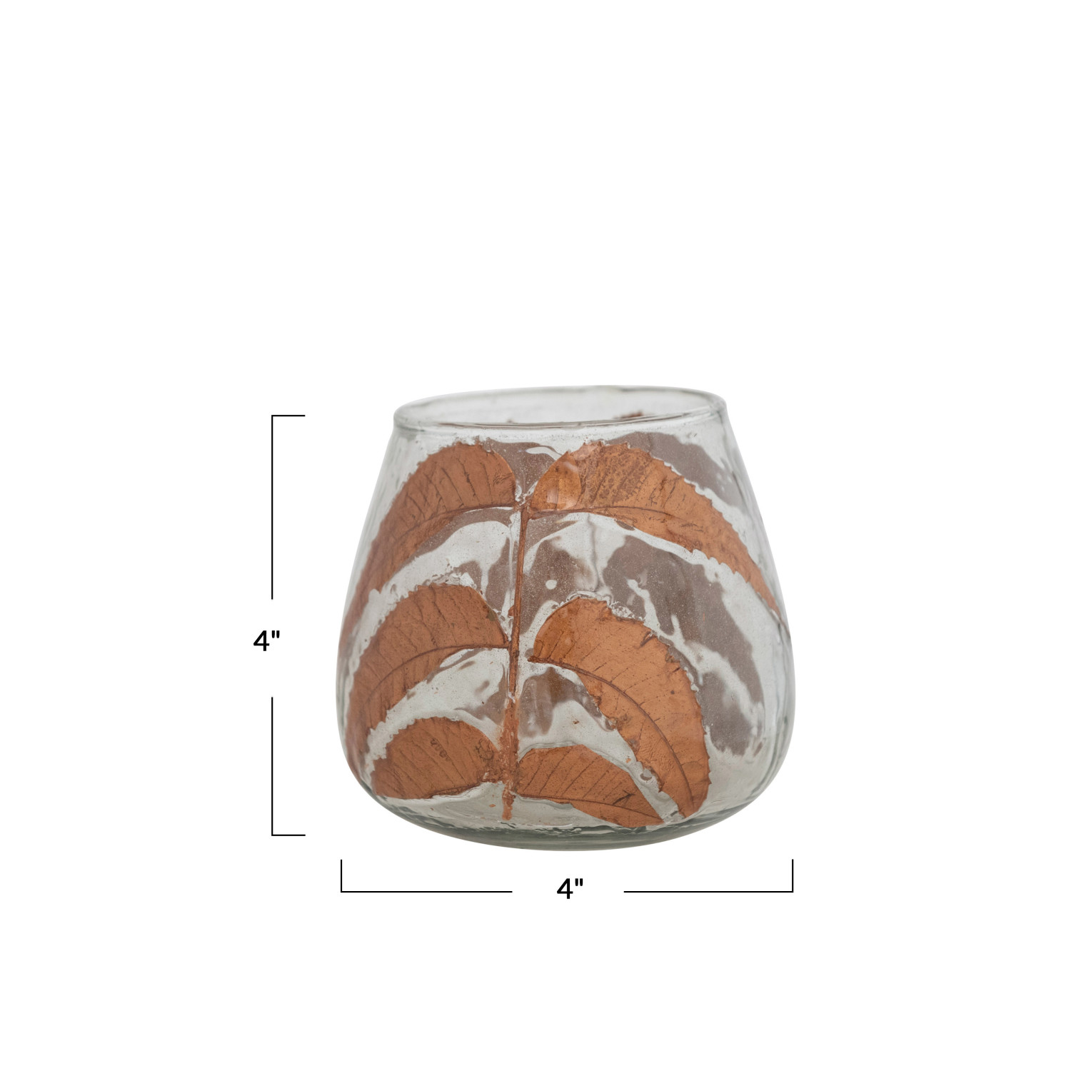 Catalog Name: 4" Round x 4"H Glass Votive Holder w/ Embedded Natural Neem Leaves, Copper Finish
