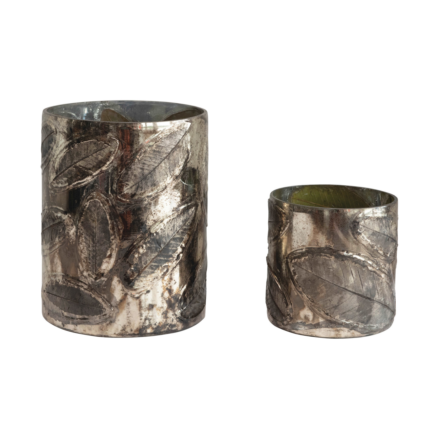 Catalog Name: 6-1/4" Round x 8-1/4"H Embossed Mercury Glass Candle Holder w/ Leaves, Oxidized Silver Finish