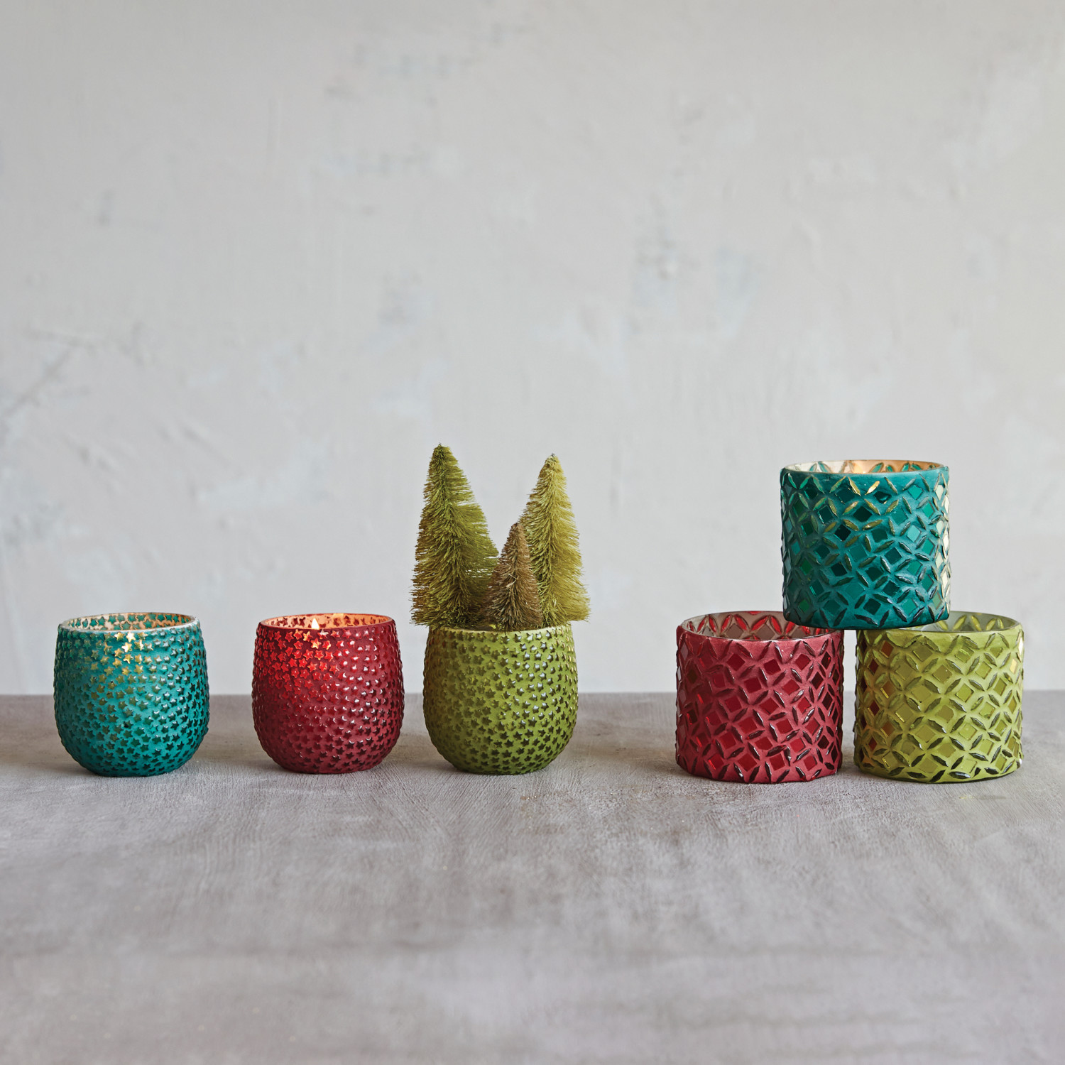Catalog Name: 3" Round x 3"H Mosaic Glass Votive Holder w/ Stars, 3 Colors
