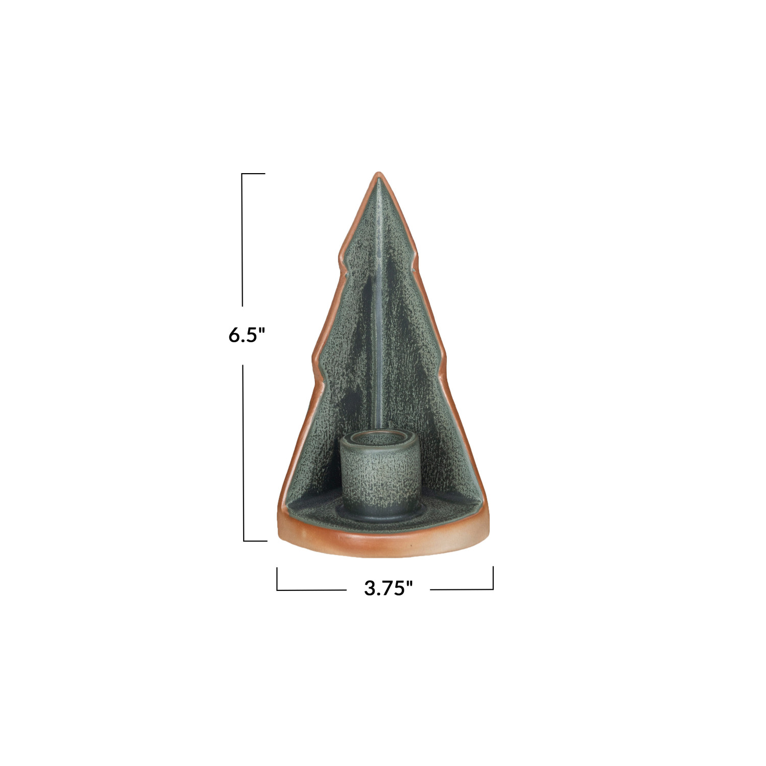 This stoneware tree taper candleholder is a fusion of natural beauty and artistic design. Standing at 6.5 inches tall, with a base 3.75 inches long and 3.5 inches wide, it's a significant presence in any room. The reactive glaze in shades of green, alongside the unglazed portions, gives each candleholder a one-of-a-kind look, ensuring that every piece is unique. Whether lit or unlit, it's a captivating addition to the decor. The intricate details of the tree branches and leaves add a touch of elegance to the overall design. Perfect for creating a cozy and inviting atmosphere in any home, this candleholder is sure to be a conversation starter among guests. A compact stoneware tree taper candleholder with a reactive glaze in verdant green, paired with unglazed sections for a rustic touch. An artistic addition that brings the tranquility of the forest into the home with its tree-like silhouette. Ideal for creating a peaceful ambiance, perfect for seasonal displays or as a year-round decorative element.