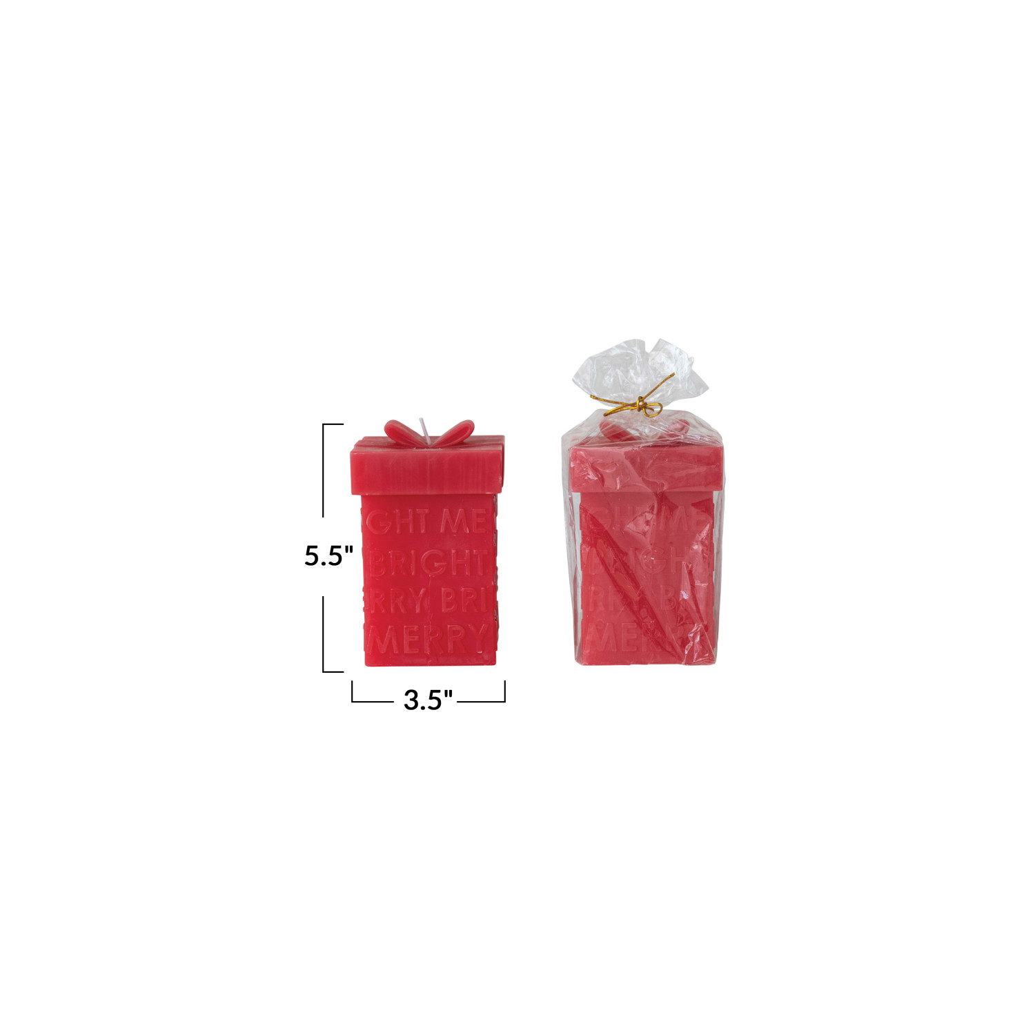 Catalog Name: 3-1/2" Square x 5-1/2"H Unscented Gift Box Shaped Candle "Merry/Bright", Red (Approximate Burn Time 75 Hours)