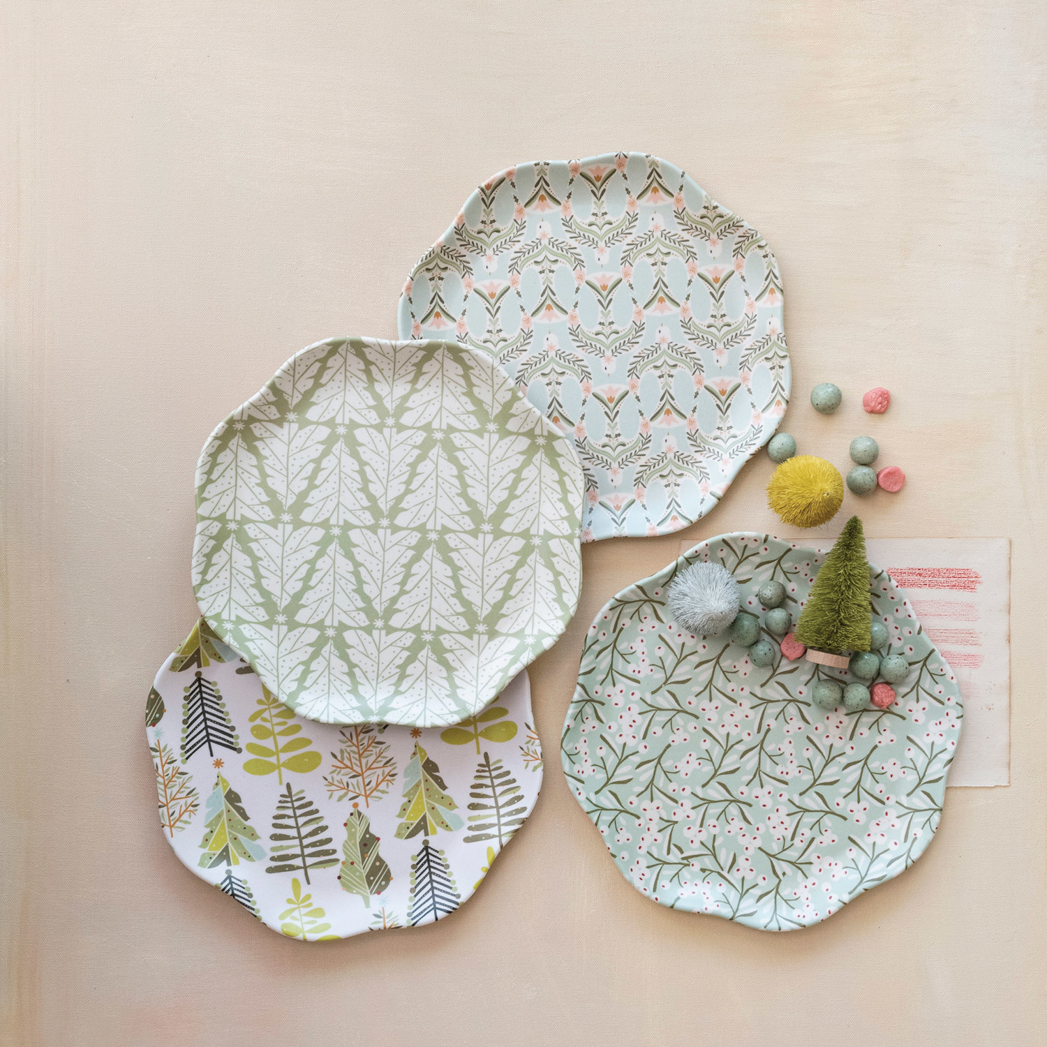 Bamboo Melamine Scalloped Plate w/ Berry/Tree/Dove Pattern, 4 Styles ©