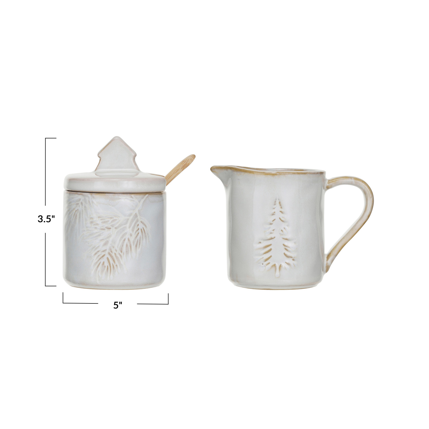 Catalog Name: 5"L x 2-3/4"W x 3-1/2"H 5 oz. Debossed Stoneware Creamer w/ Tree & 3" Round x 4"H 5 oz. Sugar Pot w/ Wood Spoon, Reactive Glaze, White, Set of 3 (Each One Will Vary)