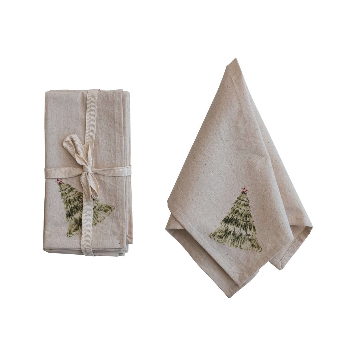 Cotton Printed Napkins w/ Christmas Tree, Natural, Green & Red, Set of 4