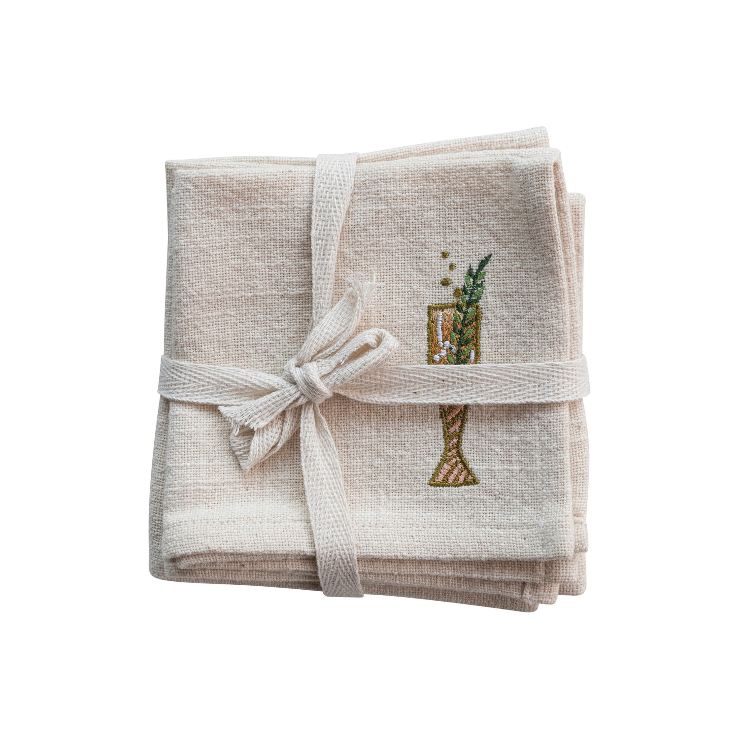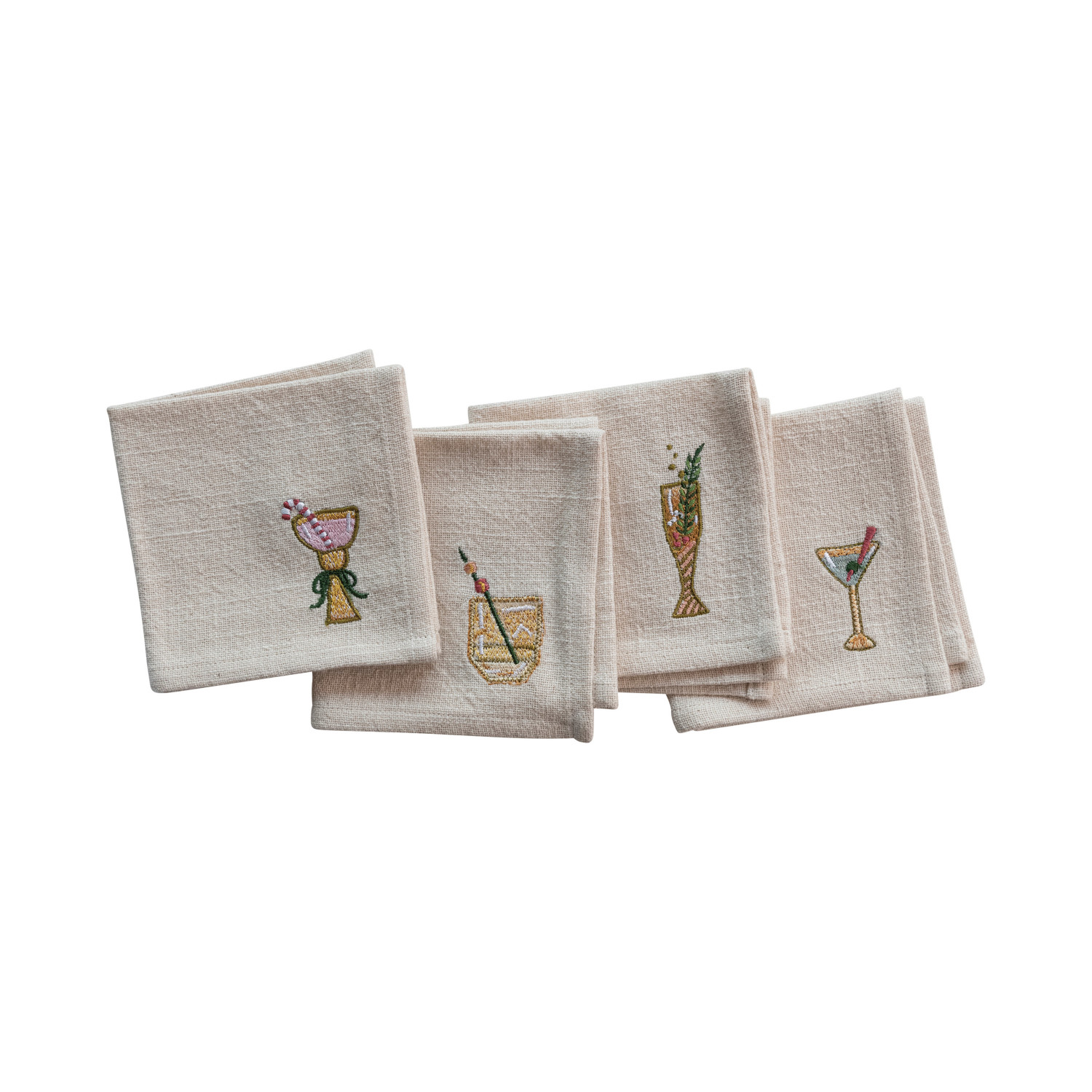 Cotton Cocktail Napkins w/ Embroidered Holiday Cocktail, Set of 4 ©