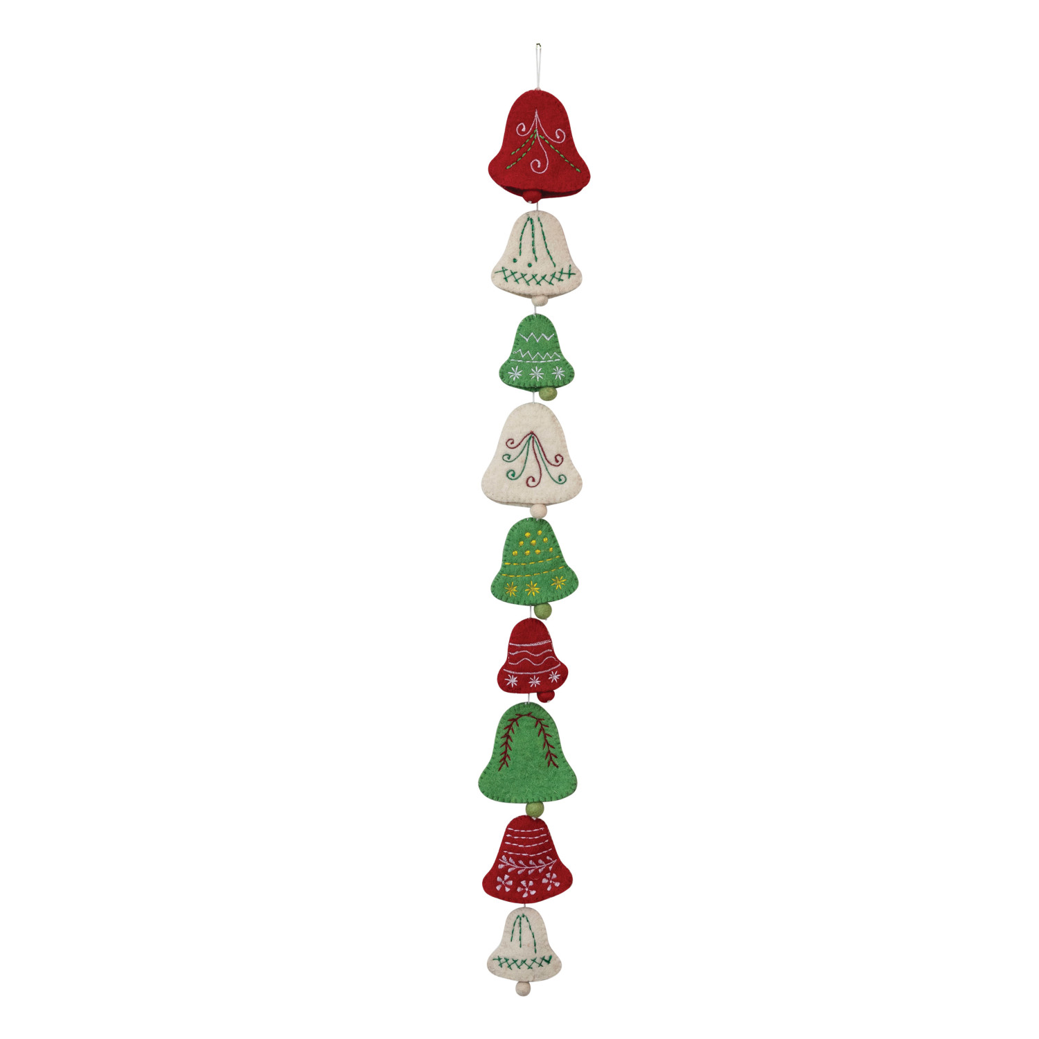 72"L Handmade Wool Felt Bell Garland w/ Embroidery, Cream Color, Red & Green