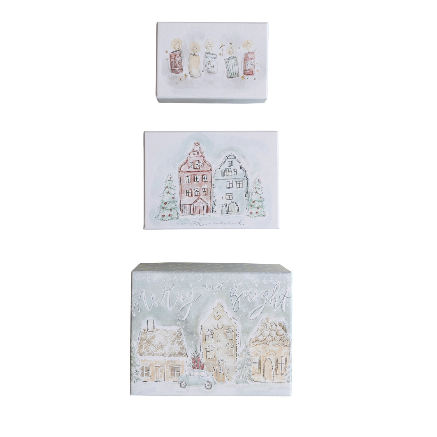 This set of 3 multicolored printed recycled paper gift boxes in various sizes is perfect for wrapping presents in an eco-friendly way. Get into the holiday spirit with our collection of holiday office and craft supplies, including festive cards, gift boxes, and charming gift toppers, perfect for spreading cheer and joy to loved ones.