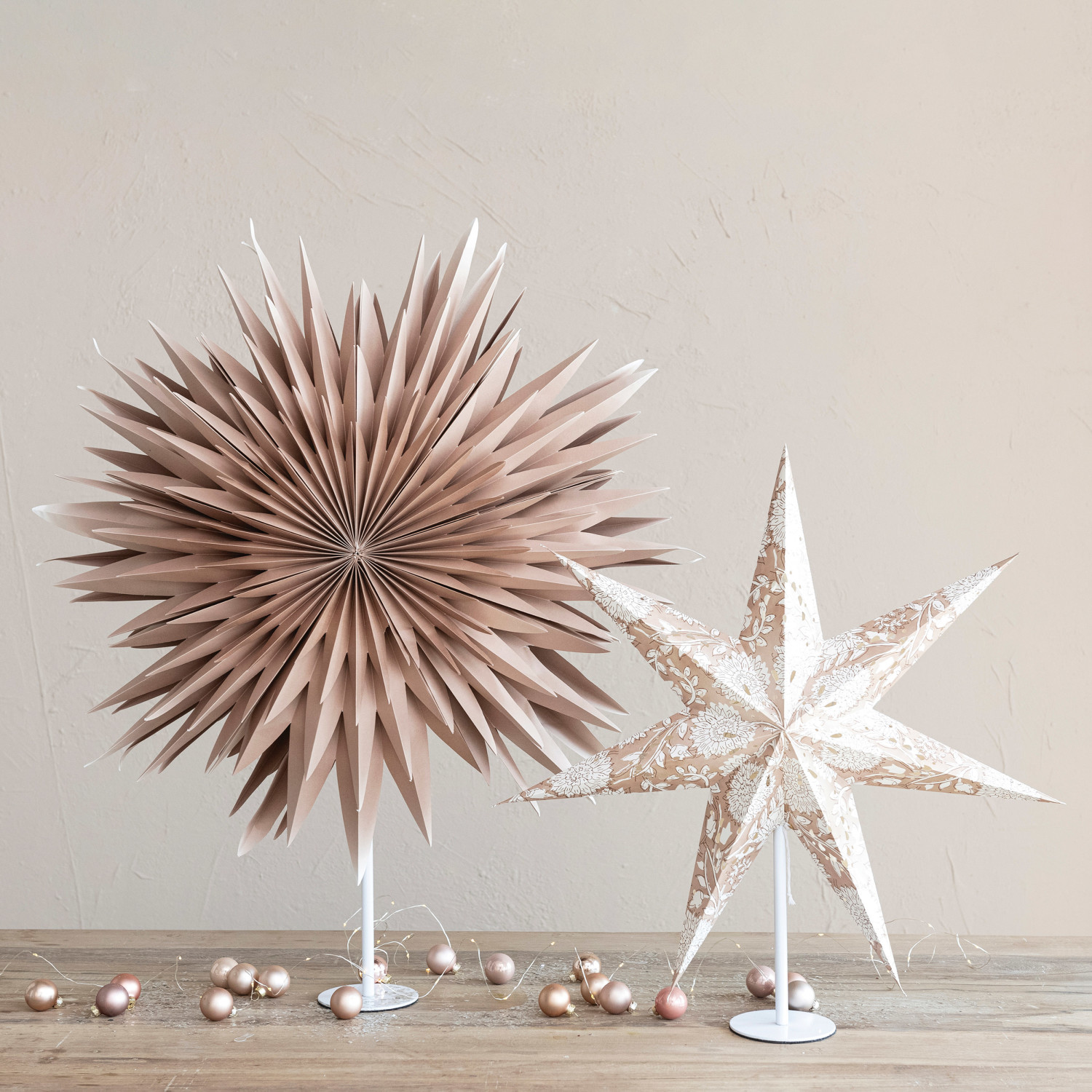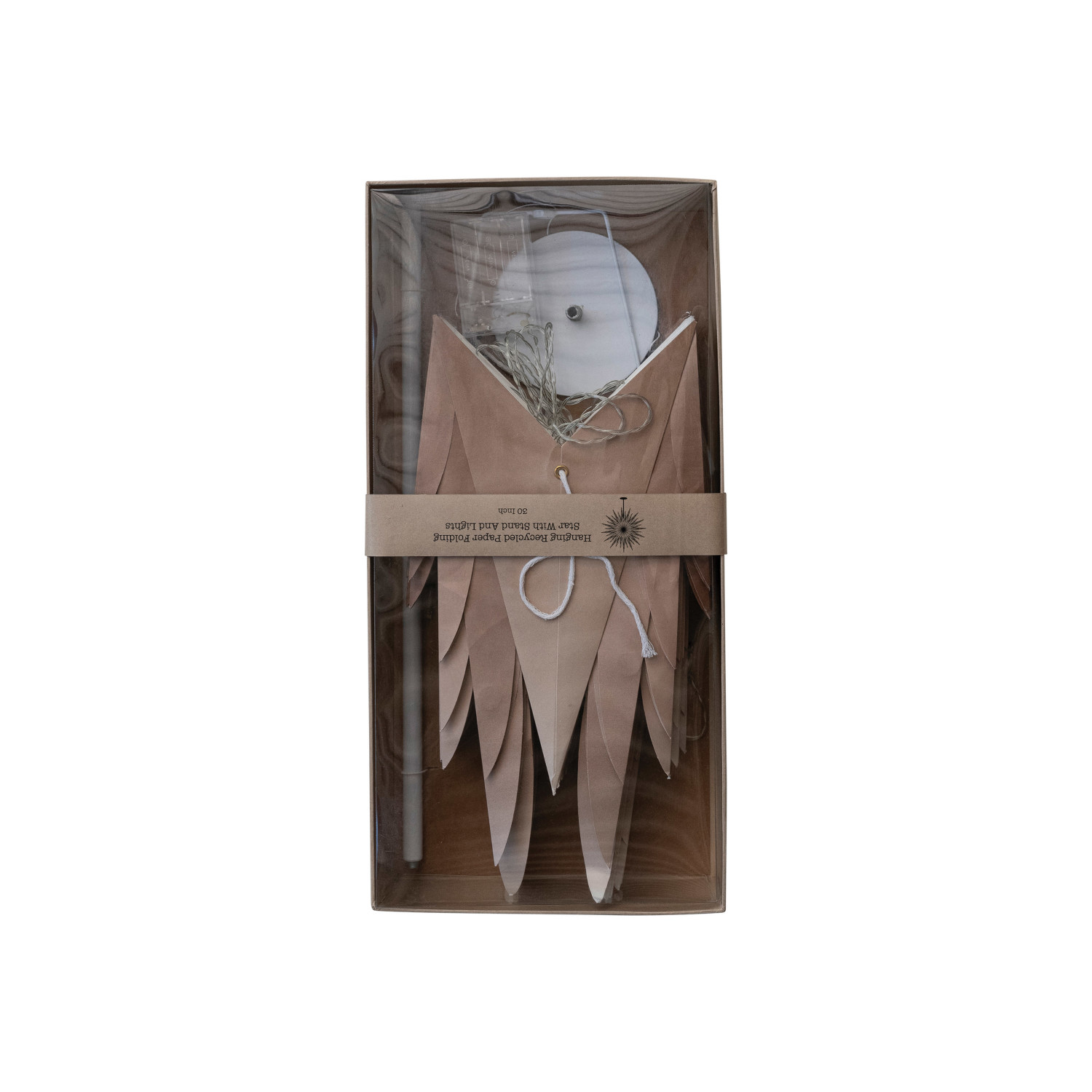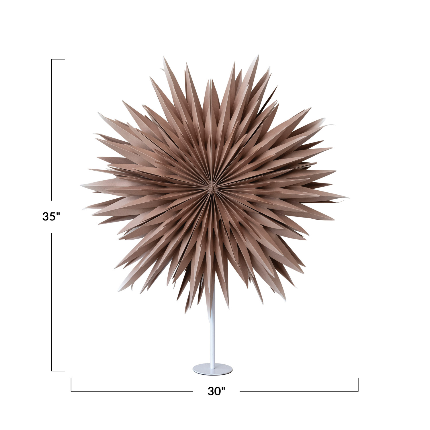 Catalog Name: 30"L x 7"W x 35"H Recycled Paper Folding Star w/ LED Light String & White Metal Stand, Brown (Requires 3-AA Batteries)