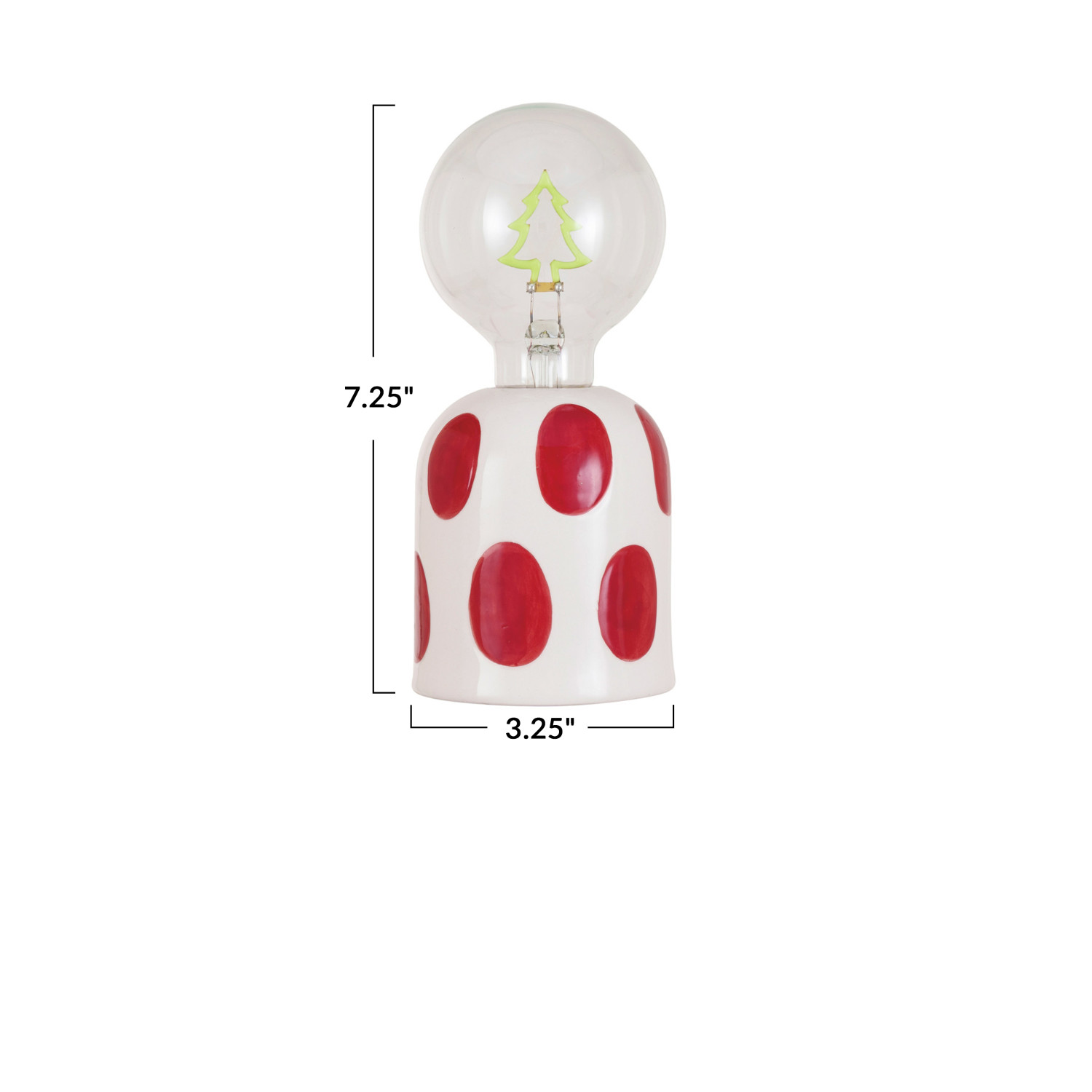 This red and white stoneware lamp with an LED tree-shaped filament lightbulb and resin base is a festive and cheerful piece that will brighten up any space. A bright red and white color scheme gives the lamp a festive and joyous look. The lamp's tree-shaped design adds individuality and whimsy, providing a gorgeous and unusual presentation. The lamp's LED tree-shaped filament lightbulb offers charm and glamor. The lamp's resin base is simple and beautiful, producing a magnificent and distinctive display. The lamp is made of stoneware, resin, and LED light, with a smooth and durable quality. It is easy to clean and maintain. The lamp measures 3.25 inches in diameter, 3.25 inches in width, and 7.25 inches in height. This is a versatile and stylish piece that can be displayed on a table, shelf, or mantel. It is a perfect piece to add some color and sparkle to the holiday decor. A festive and cheerful red and white stoneware lamp with LED tree shaped filament lightbulb and resin base. A perfect piece to add some color and sparkle to the holiday decor. Requires 2-pcs AA batteries.