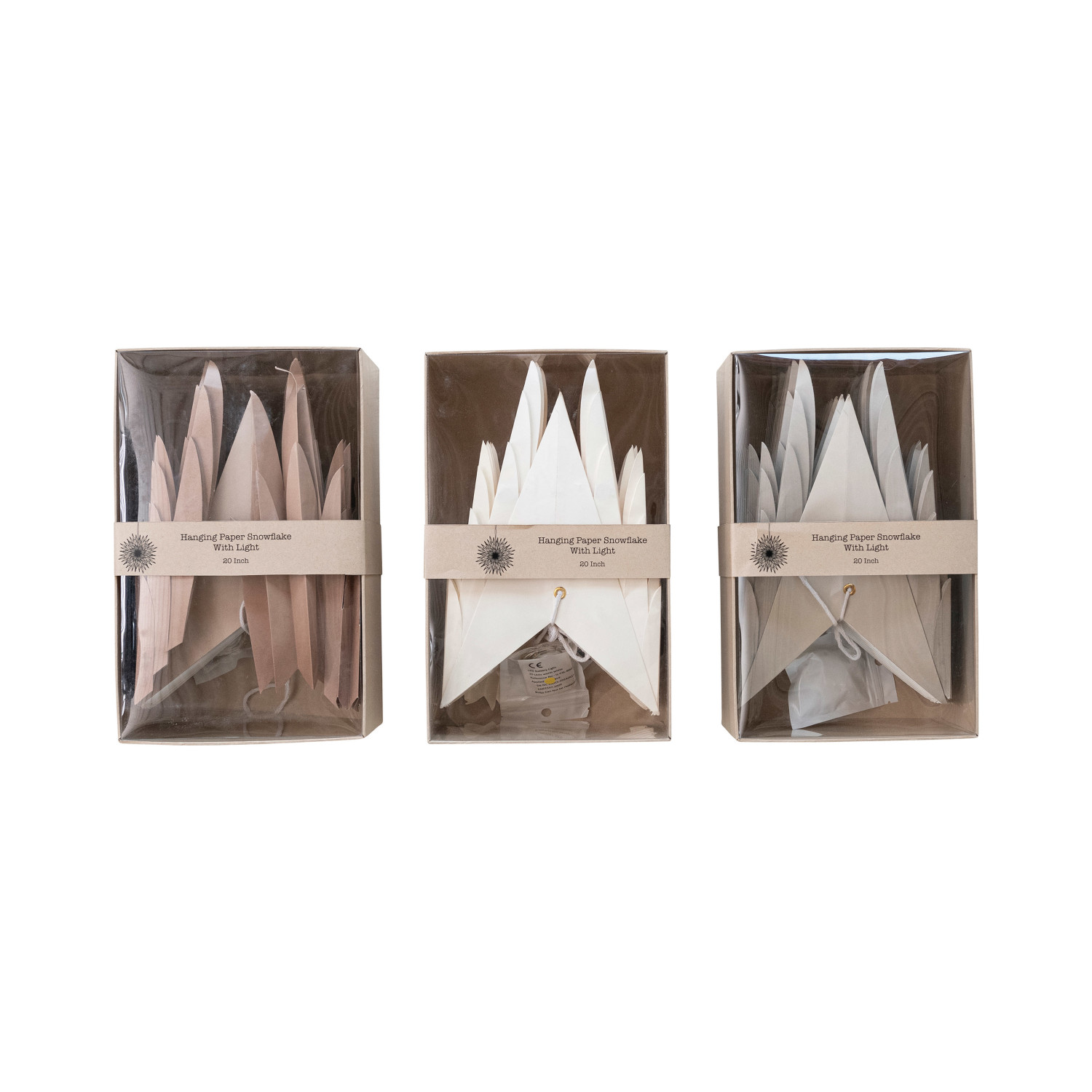 This paper-folding snowflake ornament with LED light string set is a stunning and festive way to decorate the home. The ornament features a paper-folding snowflake design that comes in three colors: cream, grey, or brown, each with its charm and personality. The ornament requires 3 AA batteries (not included) and has 10 LED lights that emit a warm and cozy glow, creating a magical and enchanting atmosphere. The ornament is made of high-quality paper and cotton that are lightweight and durable and can be folded and unfolded easily, so store and reuse it. The ornament comes with a hanging loop for easy installation. Use it as a centerpiece, a gift, or a statement piece, this ornament will illuminate the home with its beauty and style. A stunning and festive paper folding snowflake ornament with LED light string. A beautiful way to illuminate the home, as it features a paper folding snowflake design that comes in three colors. Requires 3 AA batteries (not included) and has 10 LED lights that emit a warm and cozy glow.