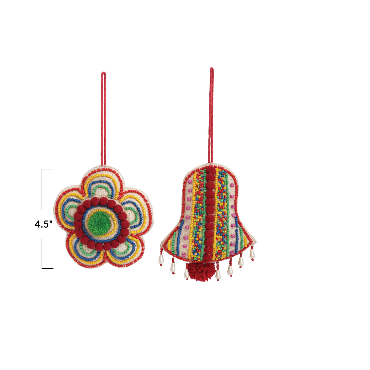 4-1/2"H Beaded Fabric Bell/Flower Ornament w/ Pom Poms, Multi Color, 2 Styles