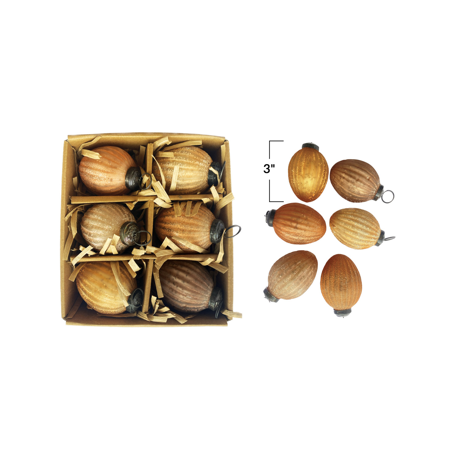 Catalog Name: 3"H Embossed Recycled Mercury Glass Ornaments, Frosted Finish, Multi Color, Boxed Set of 6