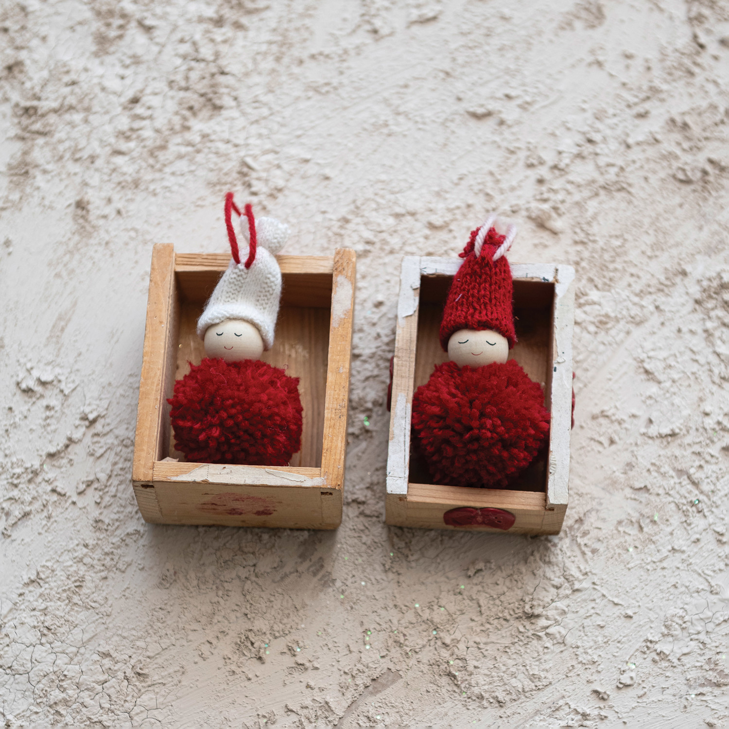 Fabric Pom Pom Person w/ Knit Hat Ornament, 2 Colors