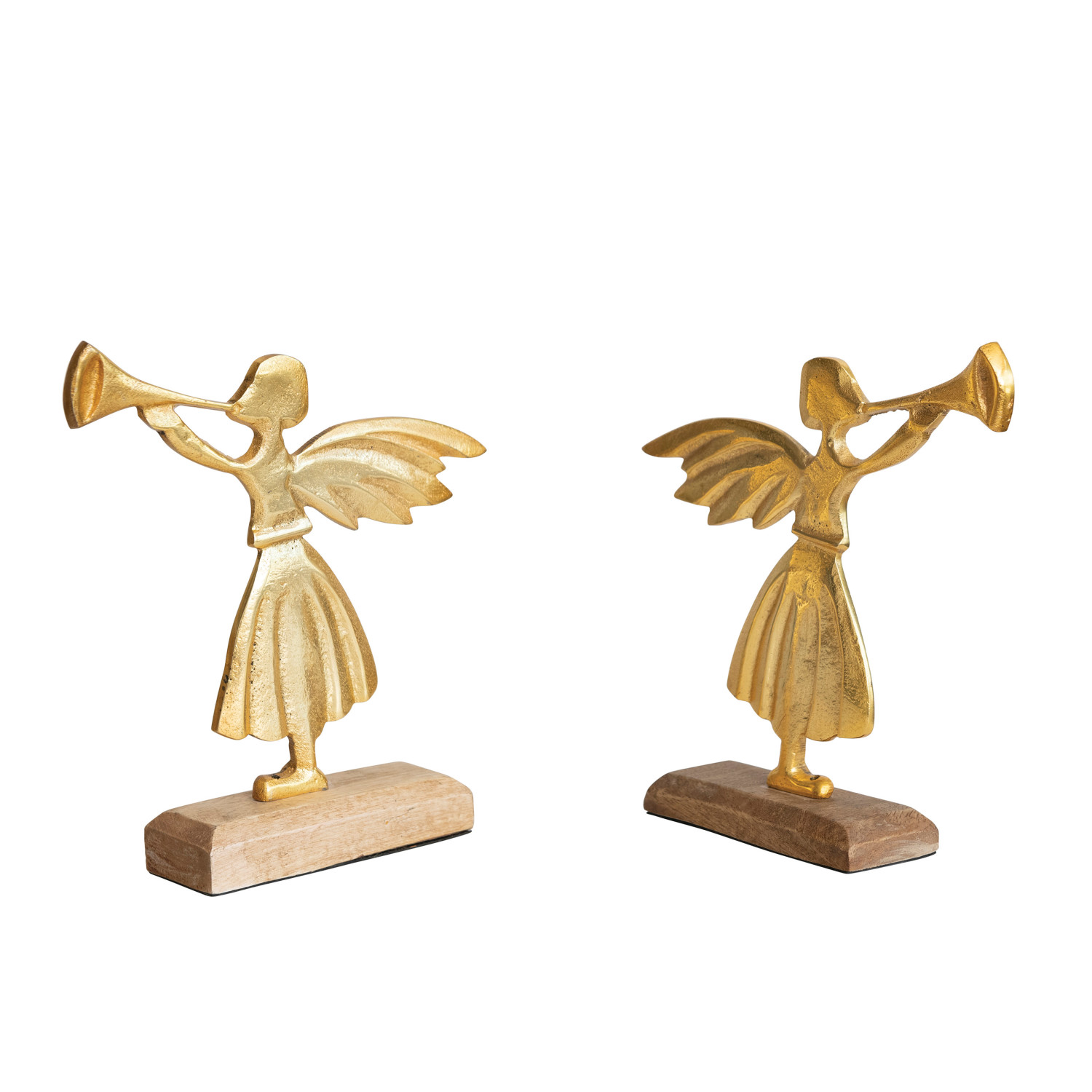 5"L x 2"W x 8-1/2"H Cast Aluminum Angels on Mango Wood Bases, Gold Finish & Natural, Set of 2
